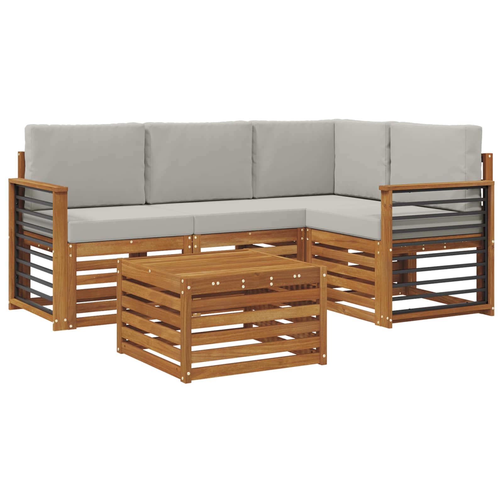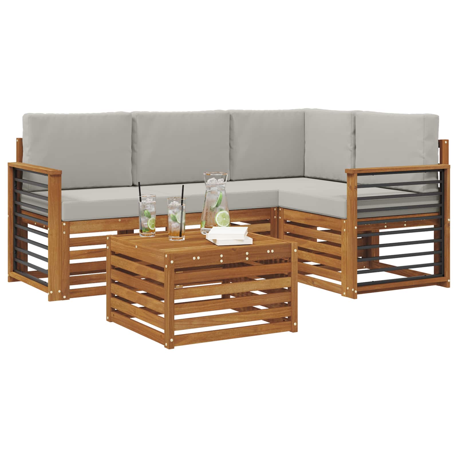 Acest set de canapea sectională pentru exterior aduce împreună un design modern cu o funcționalitate practică, perfect pentru grădină, terasă sau în jurul piscinei. E realizat din lemn masiv de acacia, având o nuanță frumoasă de maro. Fie că ești cu prietenii sau vrei doar să te bucuri de o cafea, acest set e versatil, permițându-ți să-l aranjezi cum vrei.