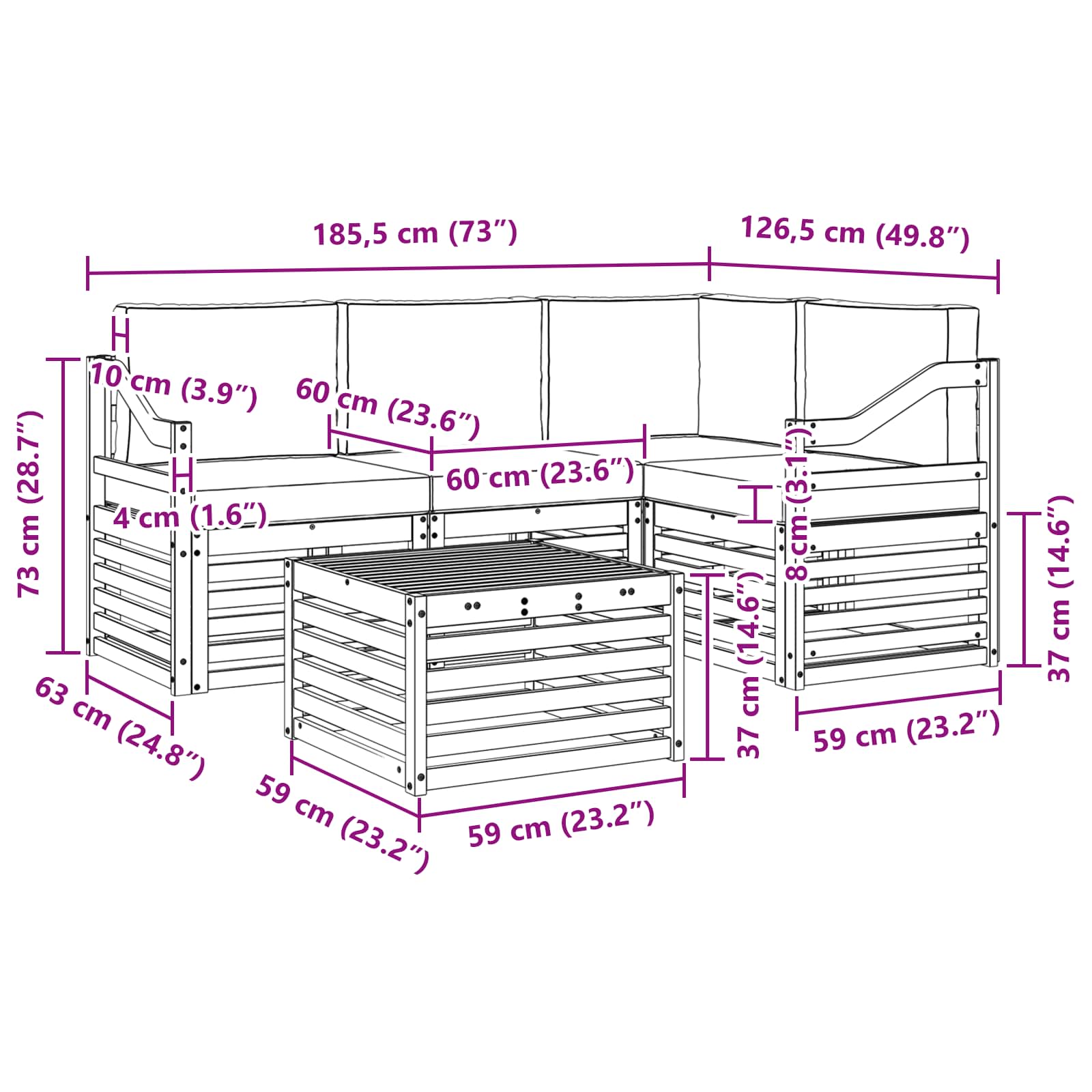 - 3 x canapea din mijloc: 63 x 59 x 73 cm (LxWxH)