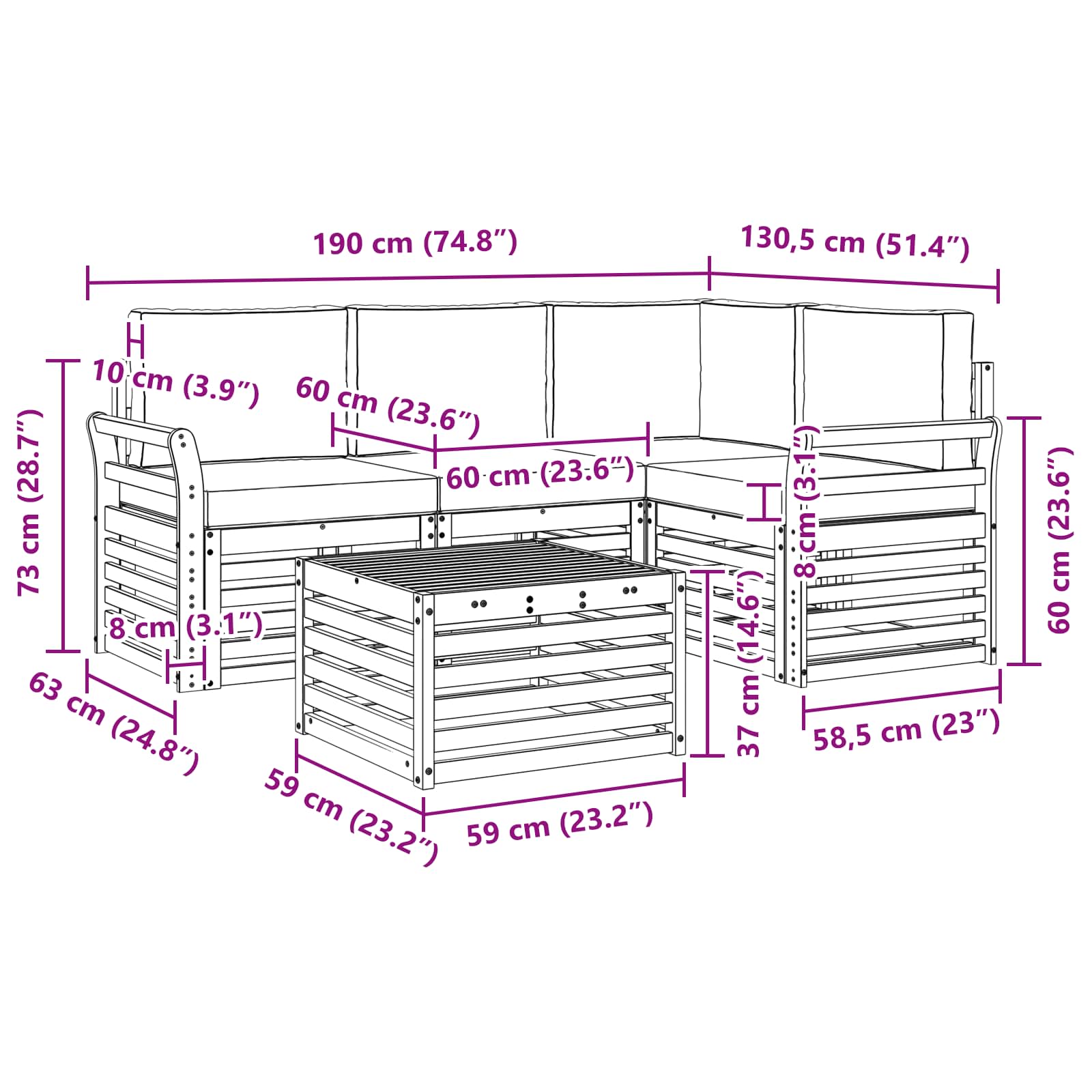 - 3 x canapea din mijloc: 63 x 59 x 73 cm (LxWxH)