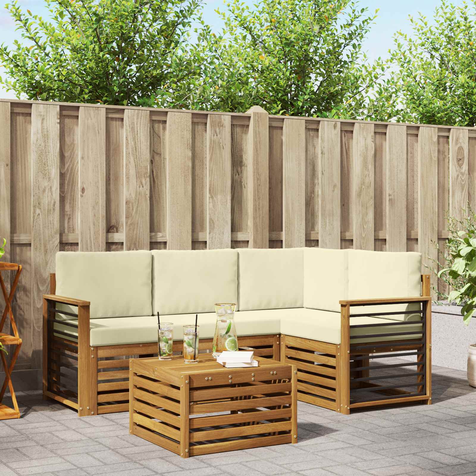 Acest set de canapea sectională pentru exterior aduce împreună un design modern cu o funcționalitate practică, perfect pentru grădină, terasă sau în jurul piscinei. E realizat din lemn masiv de acacia, având o nuanță frumoasă de maro. Fie că ești cu prietenii sau vrei doar să te bucuri de o cafea, acest set e versatil, permițându-ți să-l aranjezi cum vrei.