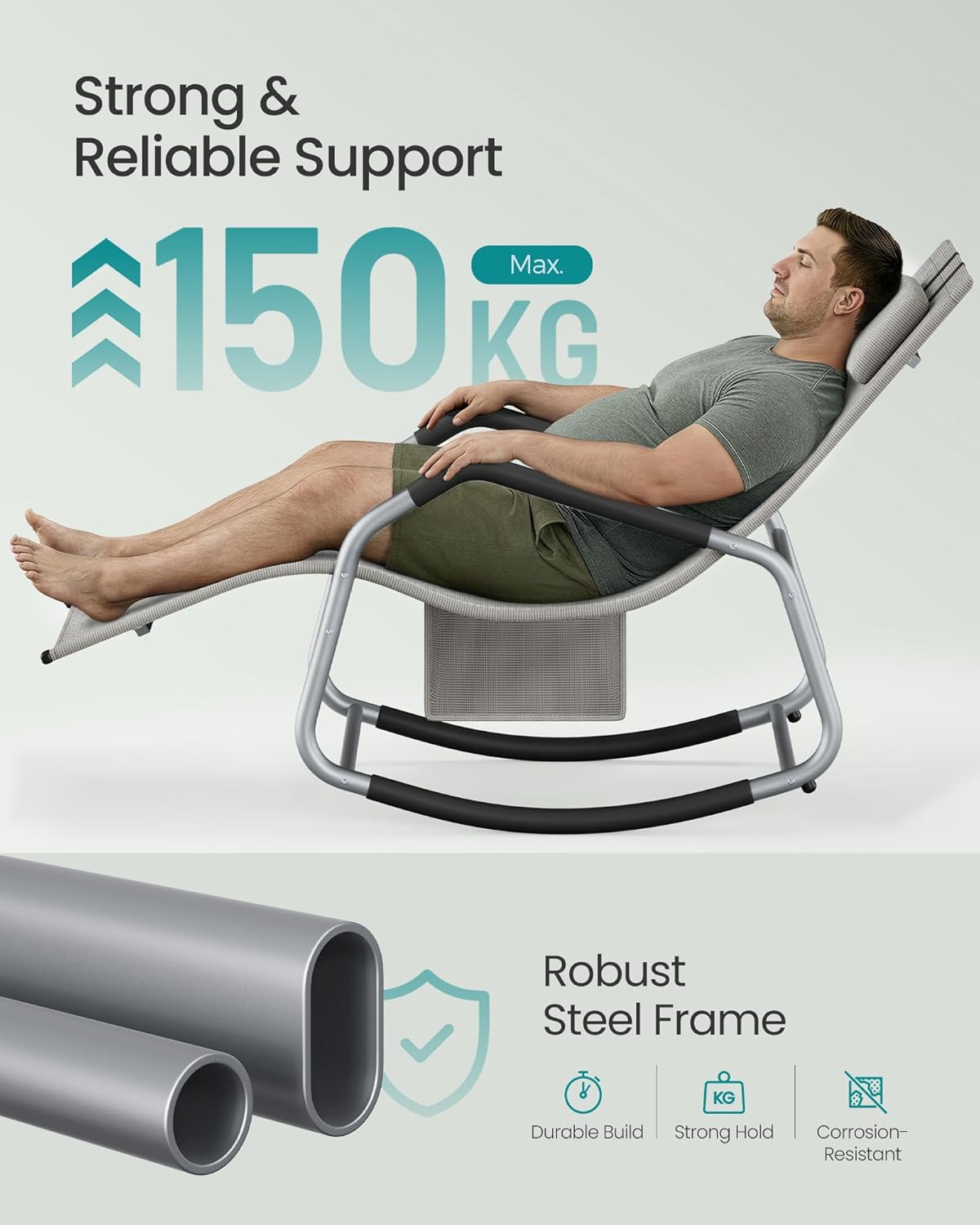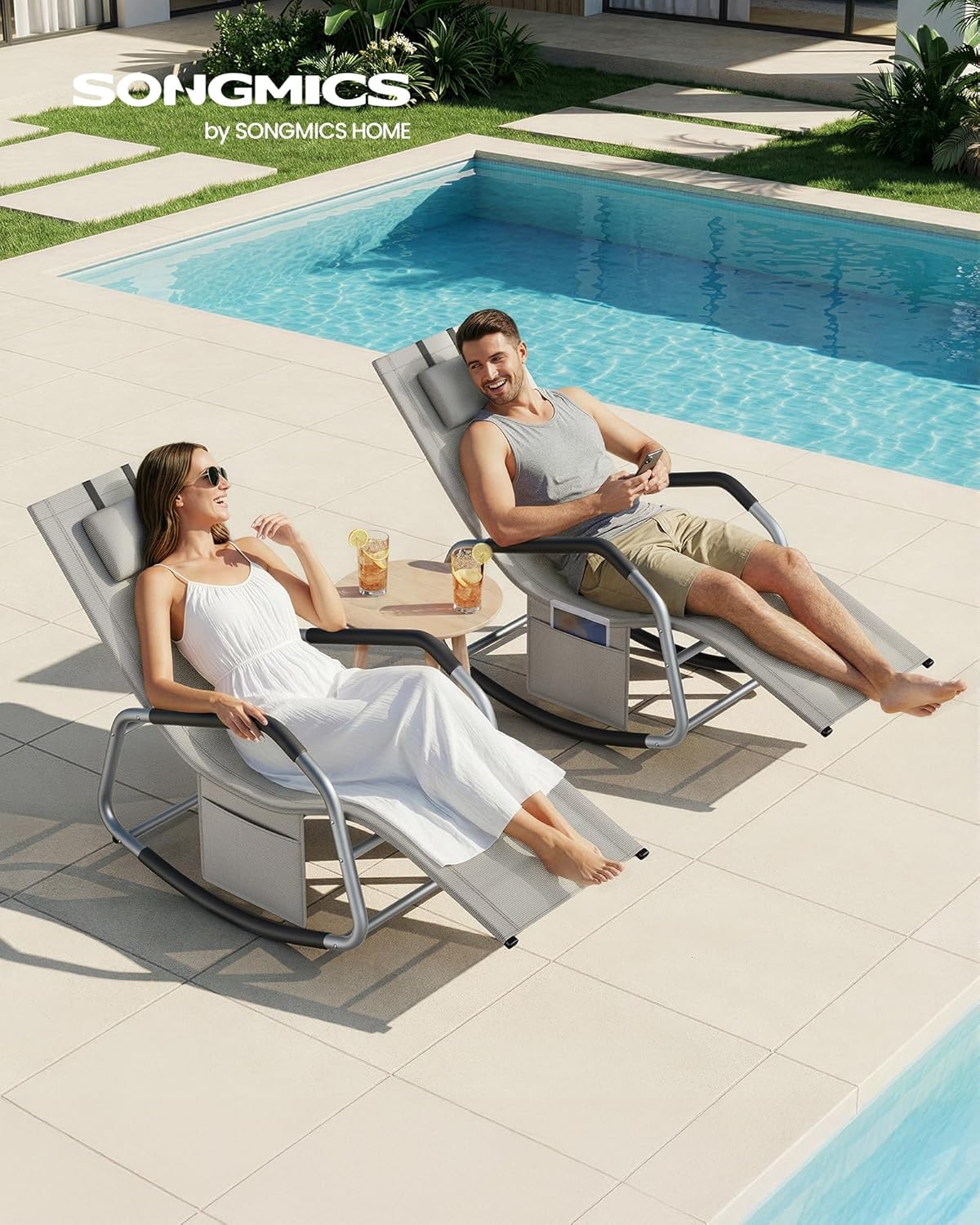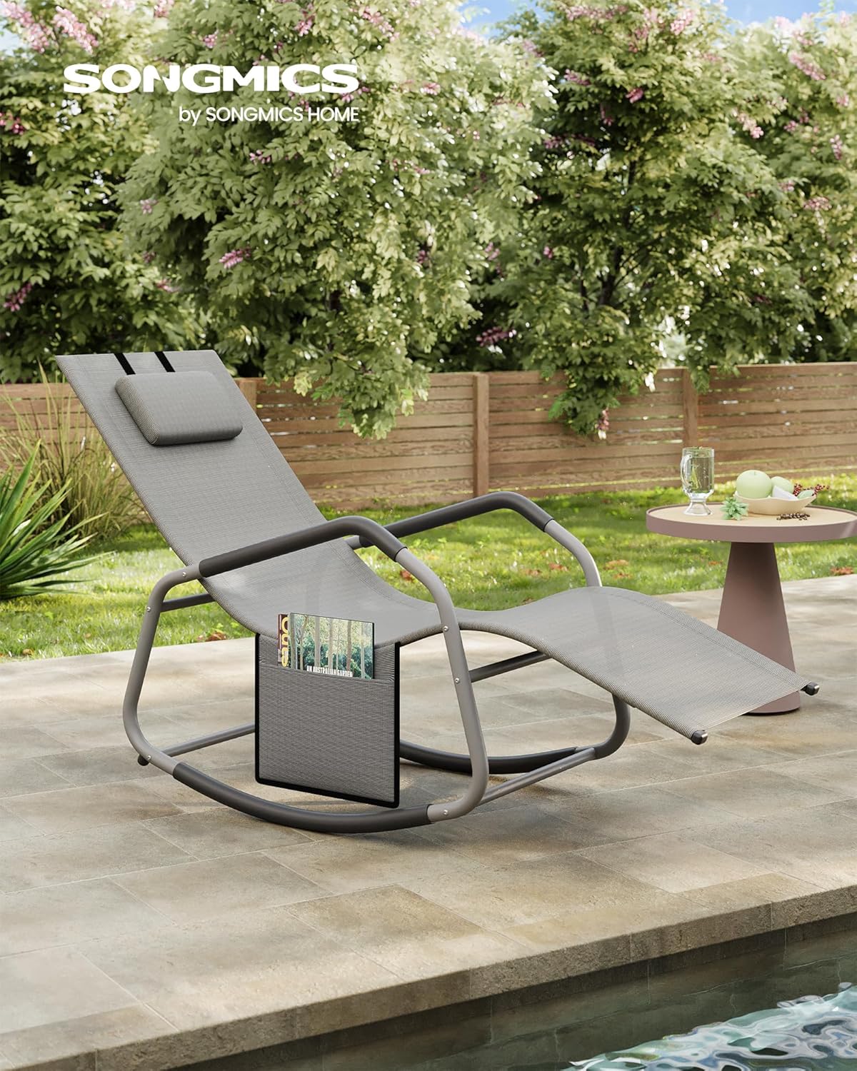Bucura-te de momente de relaxare in aer liber cu acest sezlong balansoar de gradina SONGMICS, creat pentru confort si sustinere optima. Forma ergonomica urmareste linia corpului, iar miscarea de balans este lina si placuta, ideala pentru citit, odihna sau savurarea unei dupa-amiezi insorite pe terasa ori balcon. Tetiera reglabila iti permite sa ajustezi pozitia dupa preferinte, iar buzunarul lateral pastreaza la indemana telefonul, cartea sau alte obiecte mici.