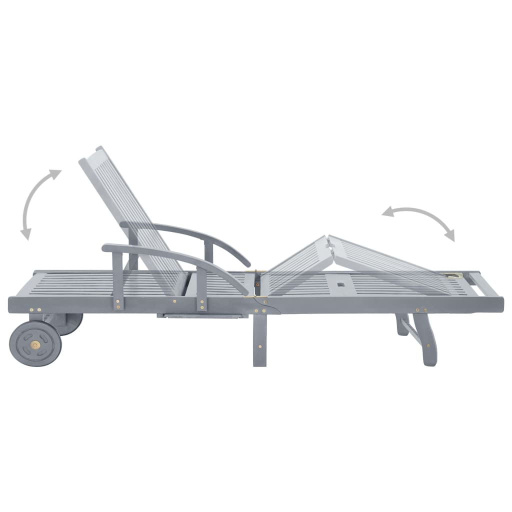 Acest șezlong de exterior este fabricat din lemn masiv de acacia, cu finisaj gri, ceea ce îi oferă robustețe și stabilitate. Spătarul și suportul pentru picioare sunt reglabile și puteți bloca șezlongul în poziția dorită. Acest șezlong de grădină poate fi mutat cu ușurință în locația dorită cu ajutorul celor 2 roți. Șezlongul este prevăzut cu o masă extensibilă convenabilă, pentru a vă așeza telefonul, ochelarii de soare, băuturile și alte obiecte mici. Perna adaugă un plus de confort în timpul relaxării. Fiecare pernă are două perechi de sfori, astfel încât să o puteți fixa bine pe șezlong.