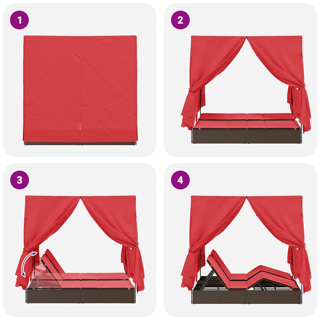 Șezlong dublu cu perdele Roșu 205 x 129 x 200 cm poliratan GartenMobel Dekor