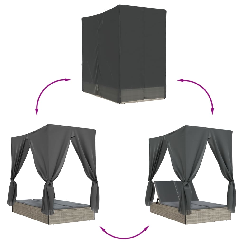 Șezlong plajă dublu cu acoperiș perdele, gri deschis, poliratan GartenMobel Dekor