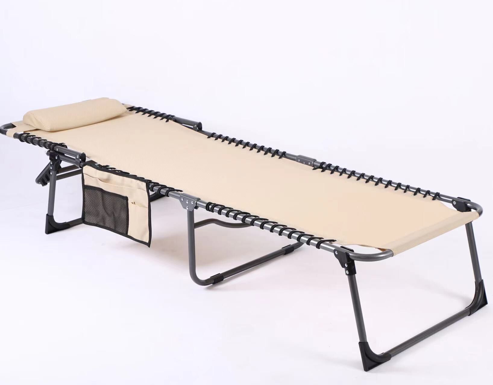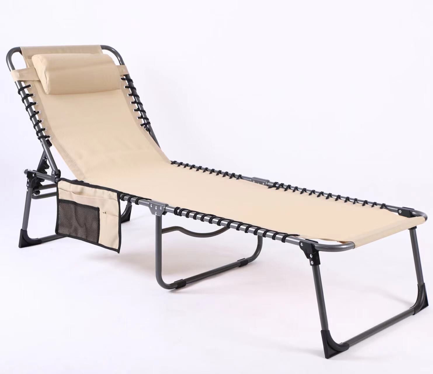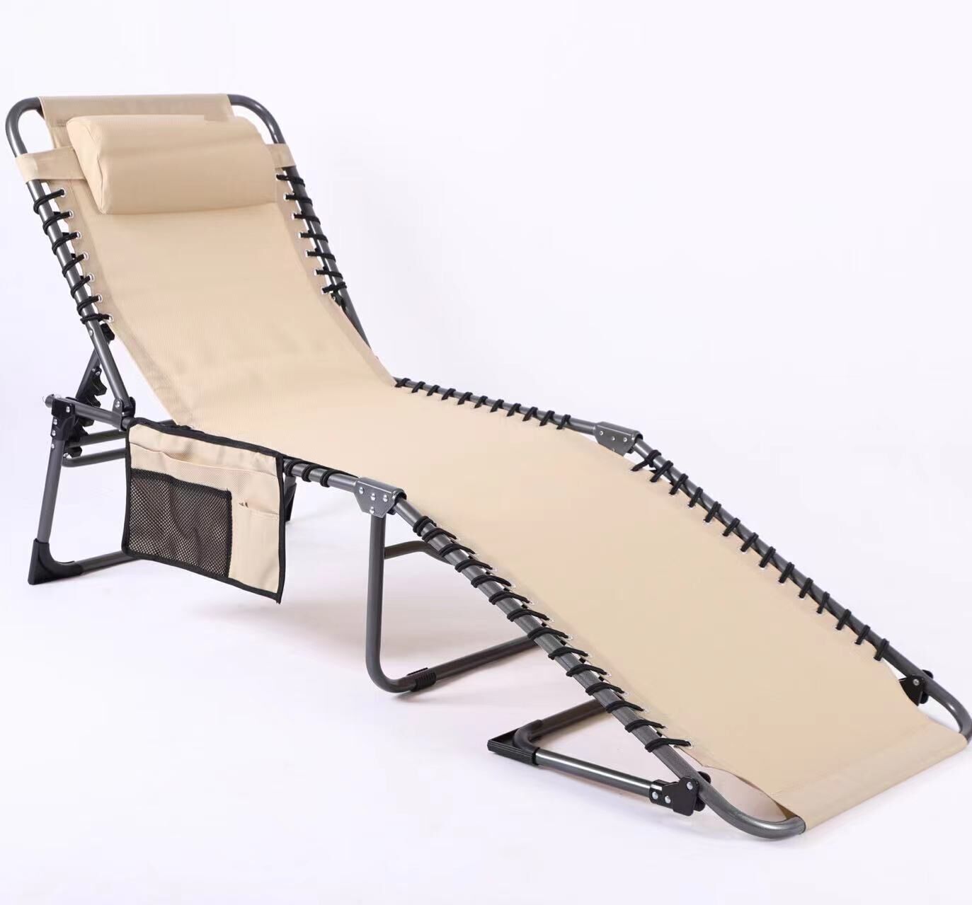 Șezlong pliabil crem 190x58 cm cu spătar reglabil, pernă și buzunar lateral