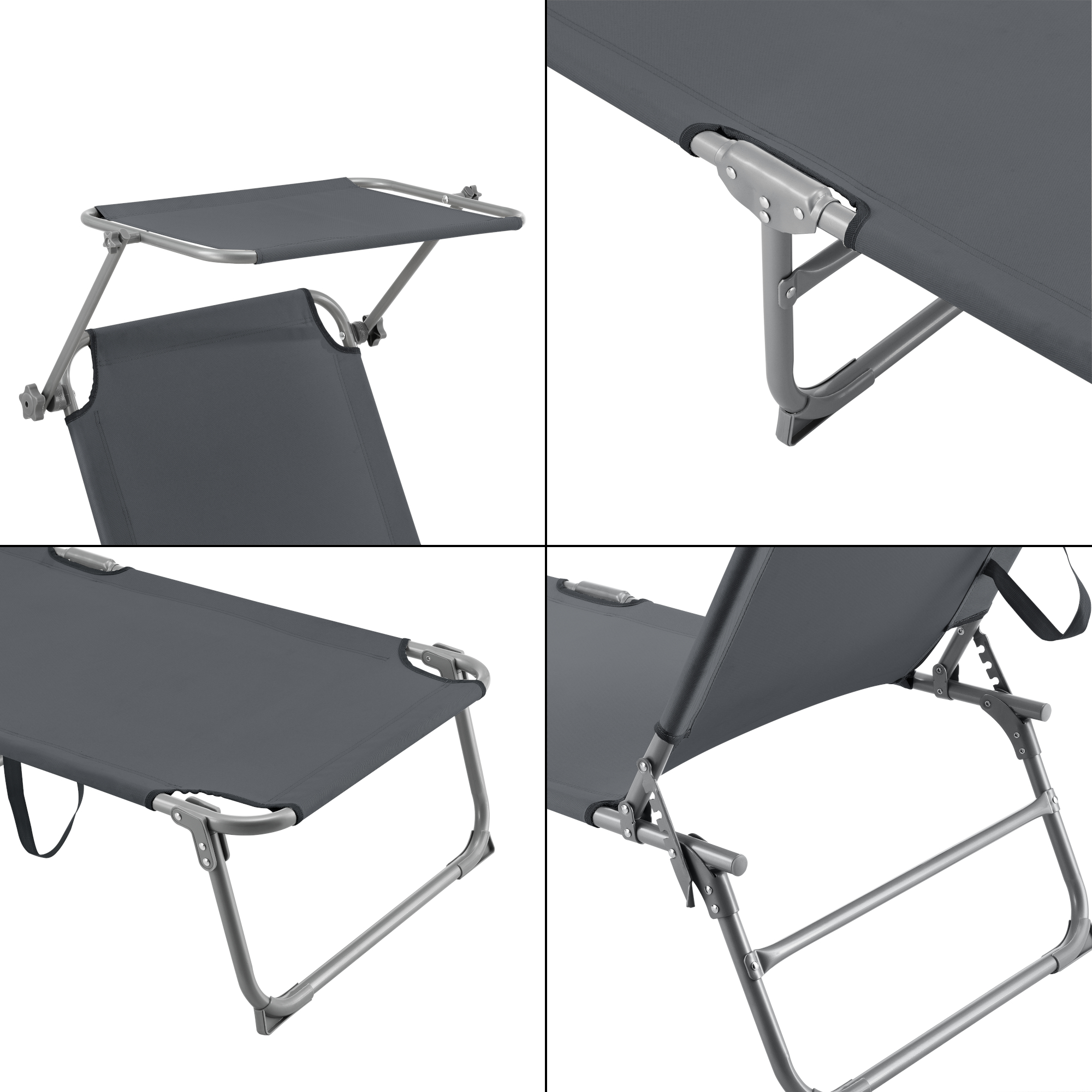 Spătarul poate fi ajustat în 4 poziții, respectiv 5 trepte incluzând poziția complet întinsă la 180°, astfel încât să găsești rapid postura potrivită pentru citit, bronzat sau odihnă. Când nu îl folosești, șezlongul se pliază compact și poate fi transportat ușor cu ajutorul mânerelor textile.