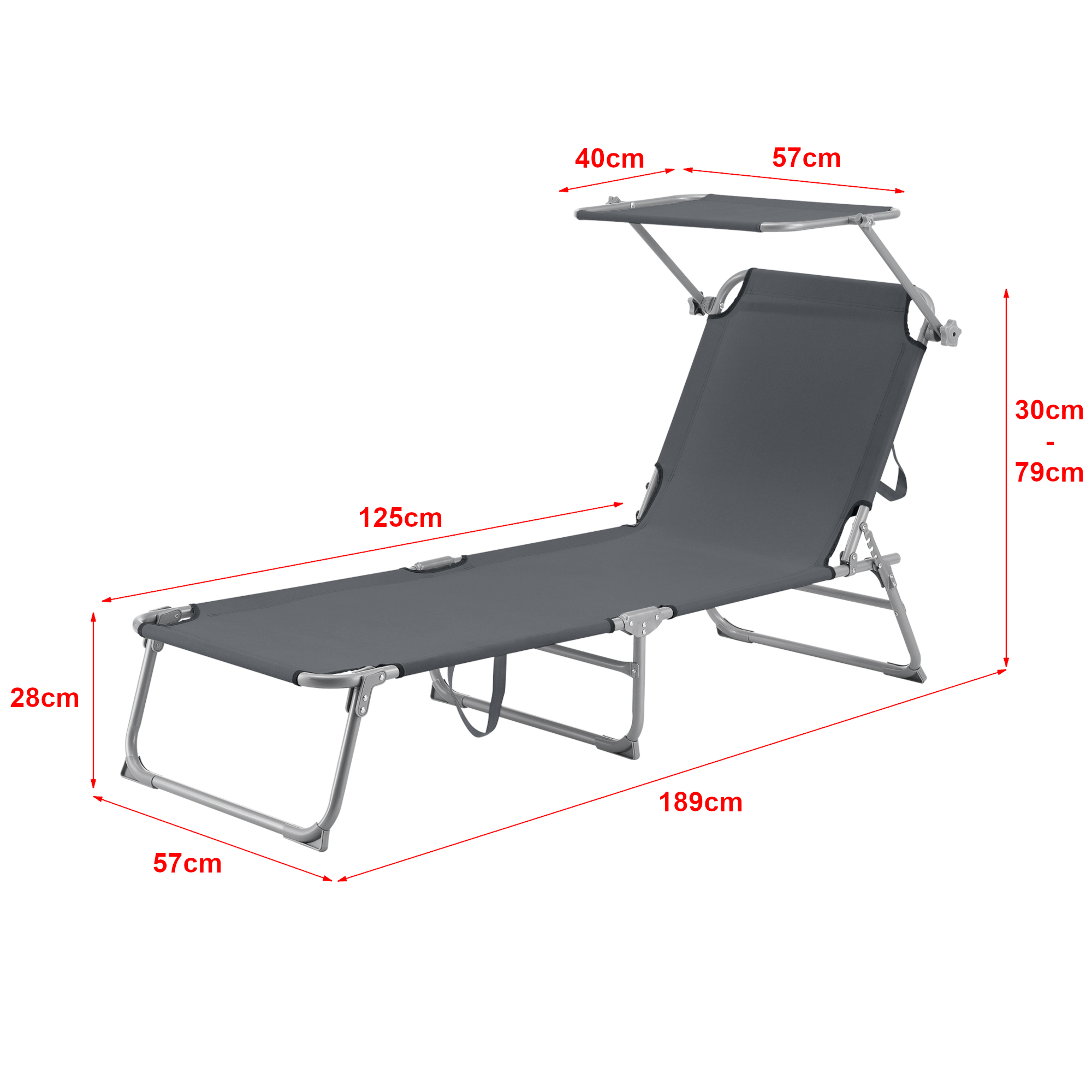 - Dimensiuni totale șezlong (L x l x h): 189 x 57 x 28 cm