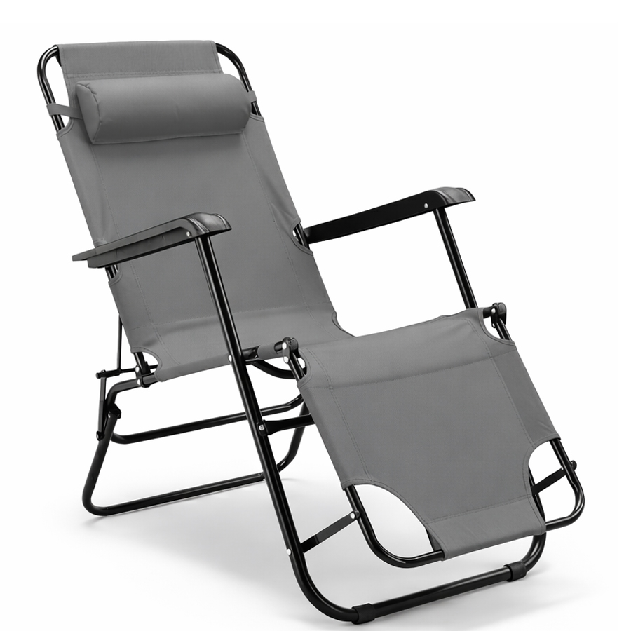 Șezlong pliabil de grădină gri, cu poziție orizontală și tetieră reglabilă
