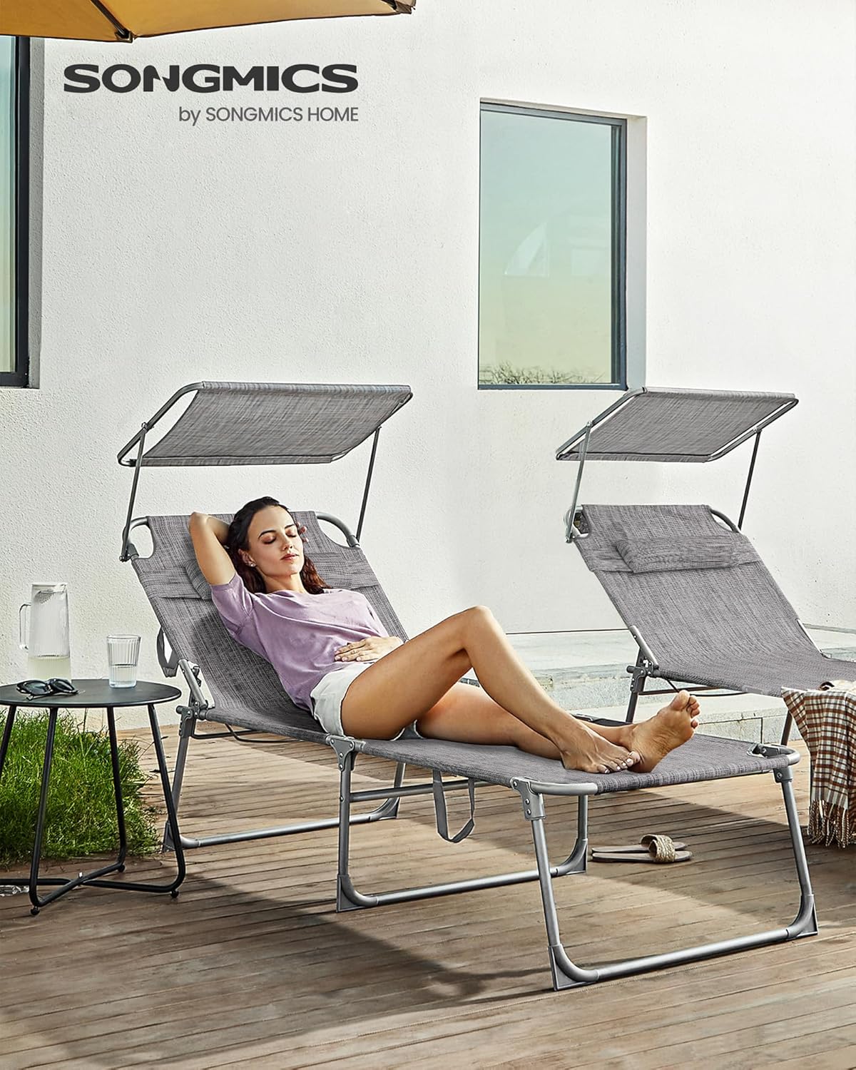 Descriere Sezlong pliabil SONGMICS parasolar, tetiera spatar