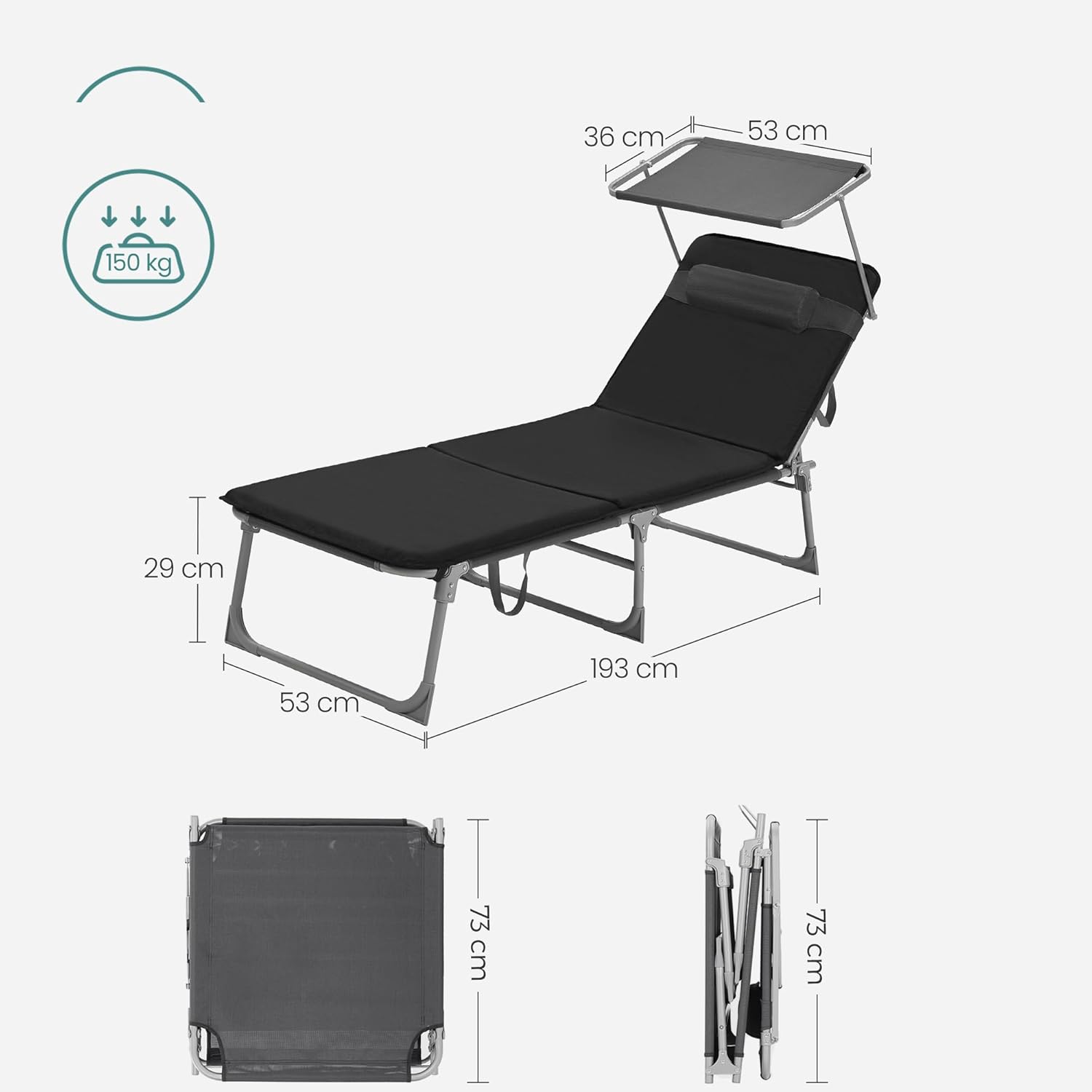 Sezlong pliabil SONGMICS cu parasolar, tetiera si spatar reglabil, negru