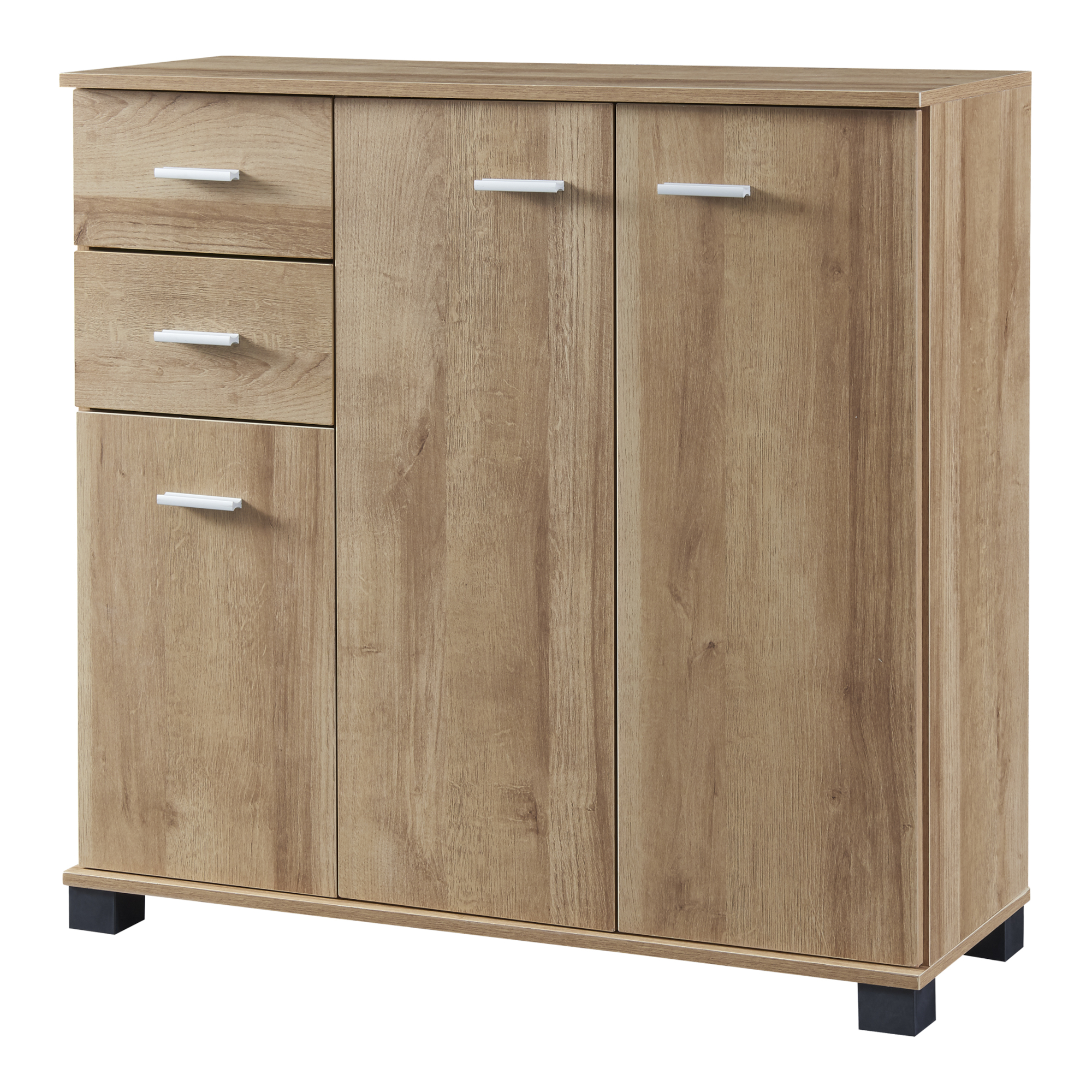 Unser Sideboard mit drei Schranktüren und zwei Schubladen ist die ideale Lösung, um Ihre Haushaltsgegenstände ordentlich und stilvoll aufzubewahren. Dank seines durchdachten Designs und der vielseitigen Einsatzmöglichkeiten eignet es sich perfekt für verschiedene Bereiche Ihres Hauses. Es überzeugt nicht nur durch sein ästhetisches Erscheinungsbild, sondern auch durch die praktischen Ablagemöglichkeiten im Inneren.