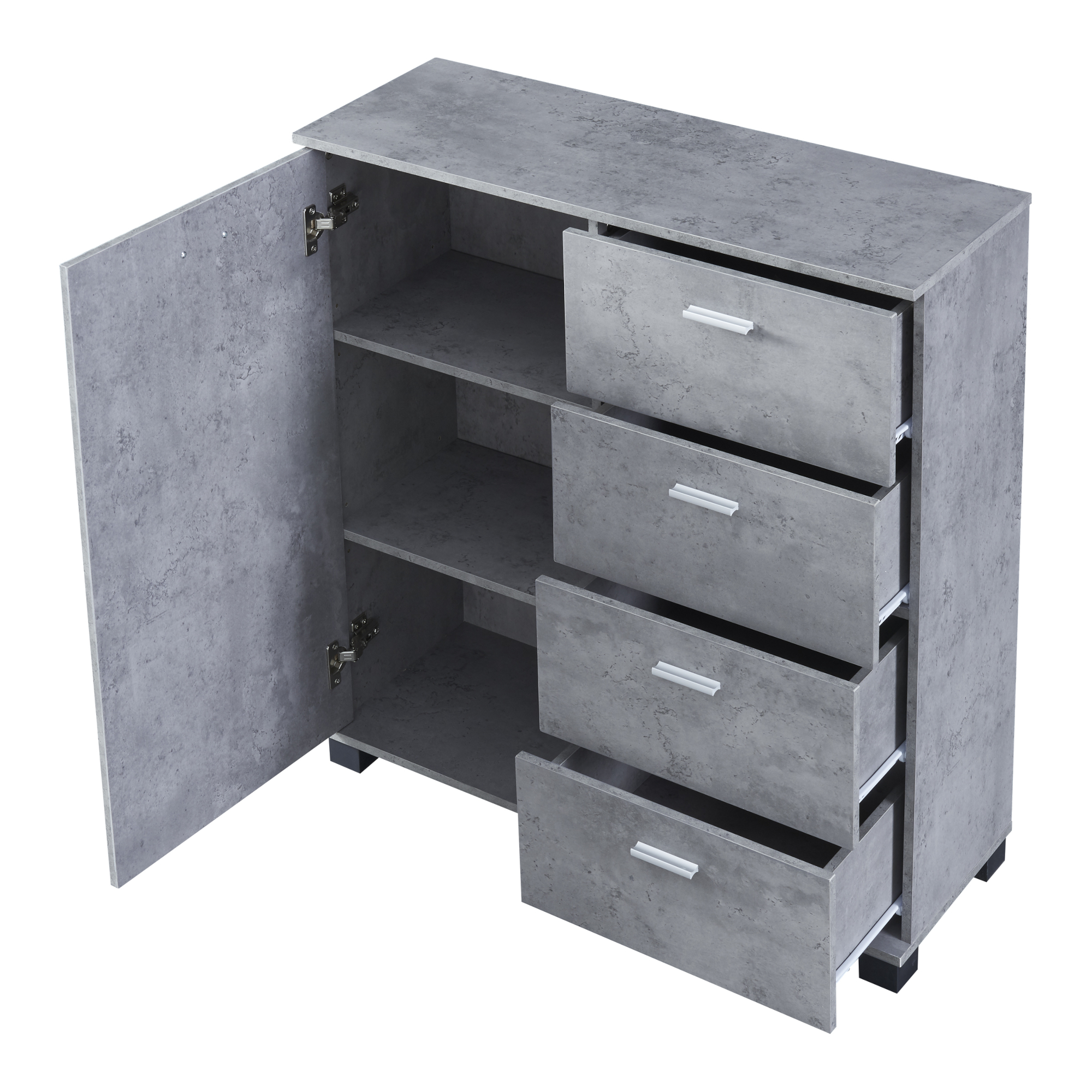 Unser Sideboard mit einer Schranktür und vier Schubladen ist die ideale Lösung, um Ihre Haushaltsgegenstände ordentlich und stilvoll aufzubewahren. Dank seines durchdachten Designs und der vielseitigen Einsatzmöglichkeiten eignet es sich perfekt für verschiedene Bereiche Ihres Hauses. Es überzeugt nicht nur durch sein ästhetisches Erscheinungsbild, sondern auch durch die praktischen Ablagemöglichkeiten im Inneren.