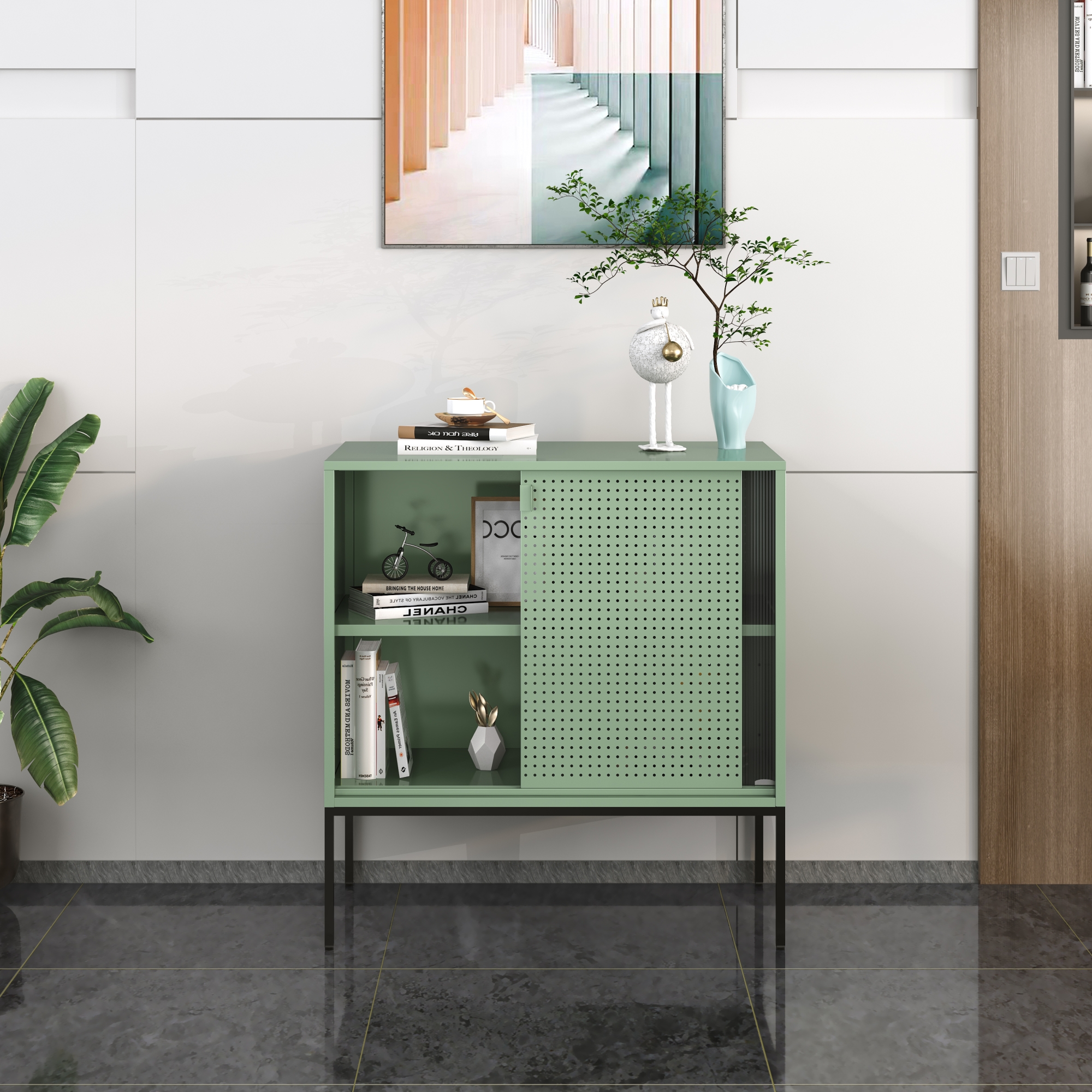 Der Wohnzimmerschrank ist ein stilvolles und praktisches Möbelstück, das Ihnen die perfekte Ergänzung für Ihren Wohnraum bietet. Er verfügt über eine dekorative Metalltür und eine zusätzliche Ablagefläche im Schrankinnern.