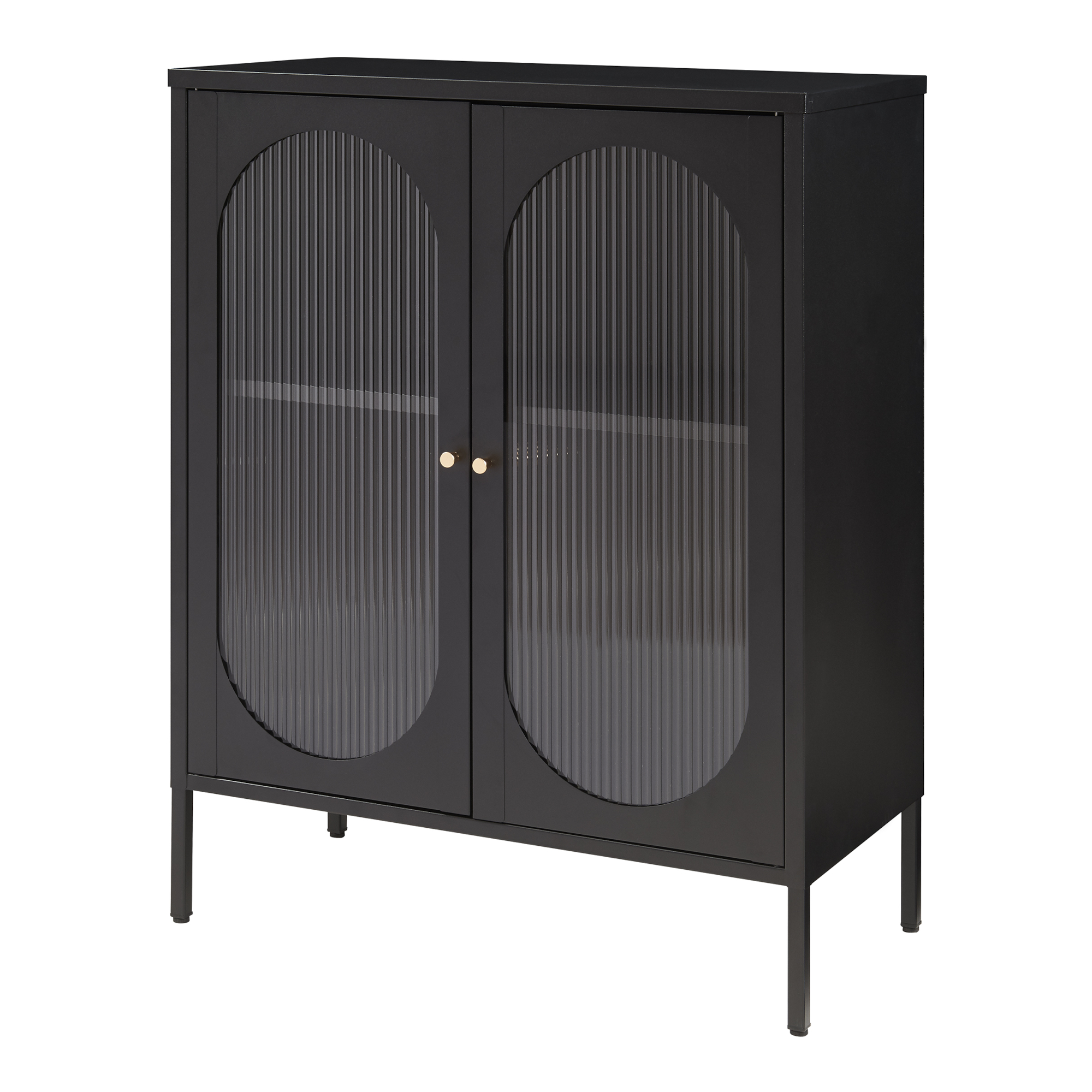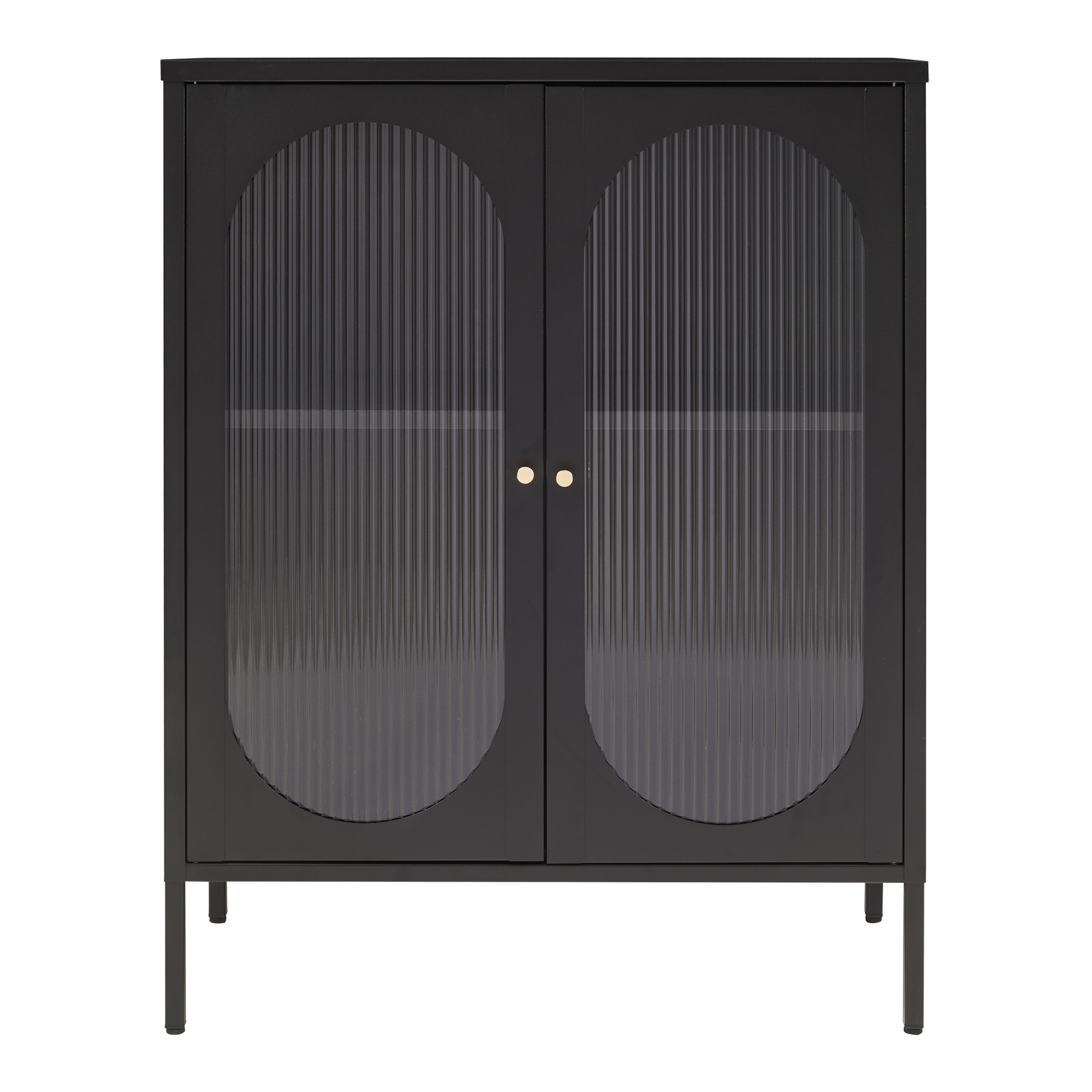 Die beiden Türen aus geriffeltem Glas setzen einen besonderen Akzent und machen das Möbelstück zum Hingucker. Mit den runden Metallgriffen lassen sie sich bequem öffnen und dank Magnetverschluss leise und zuverlässig schließen.