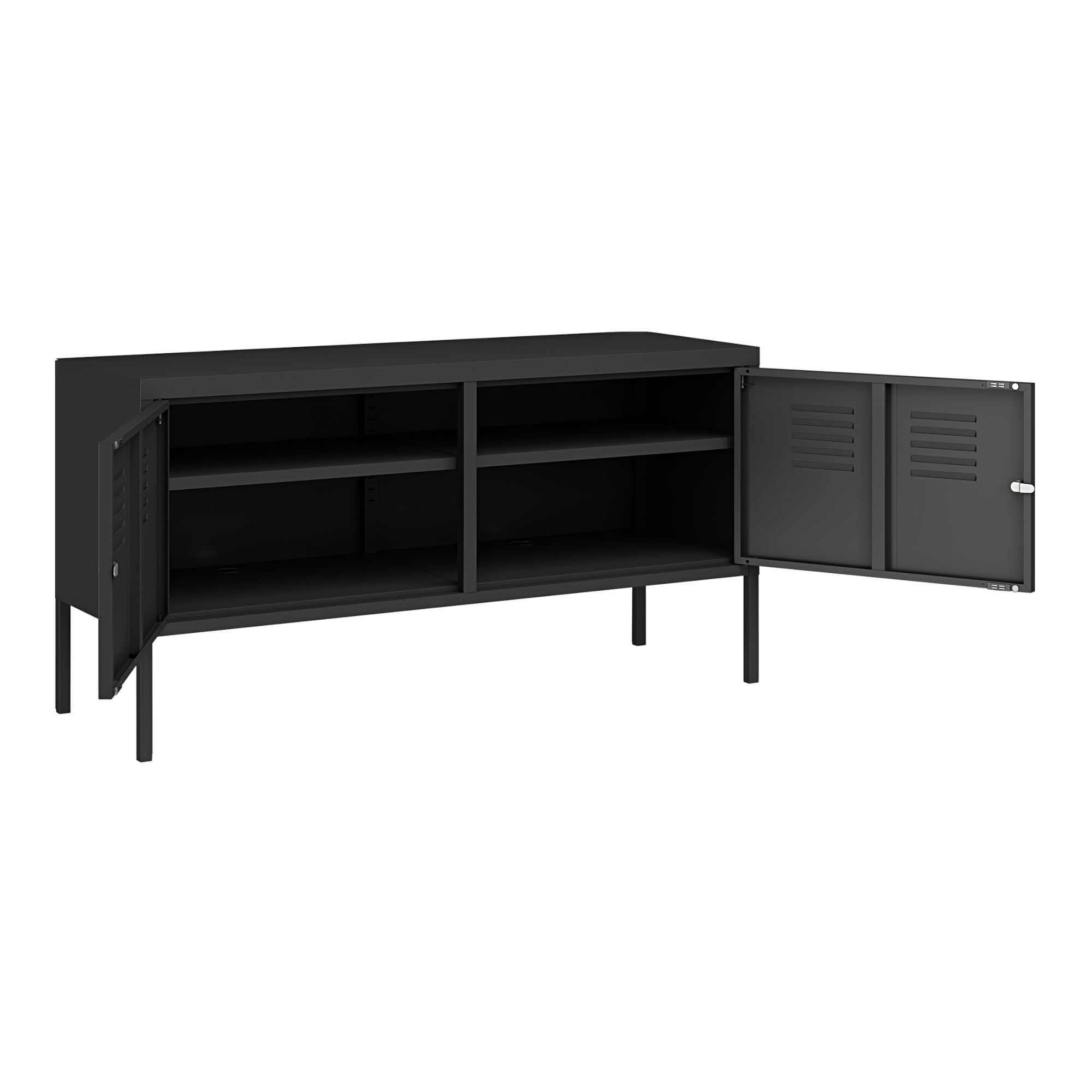 Integrierte Lüftungsschlitze an den Türen fördern die Luftzirkulation, was besonders bei der Lagerung von technischen Geräten vorteilhaft ist. Zudem sorgen die Kabeldurchlässe auf dem Boden für eine ordentliche Kabelführung.