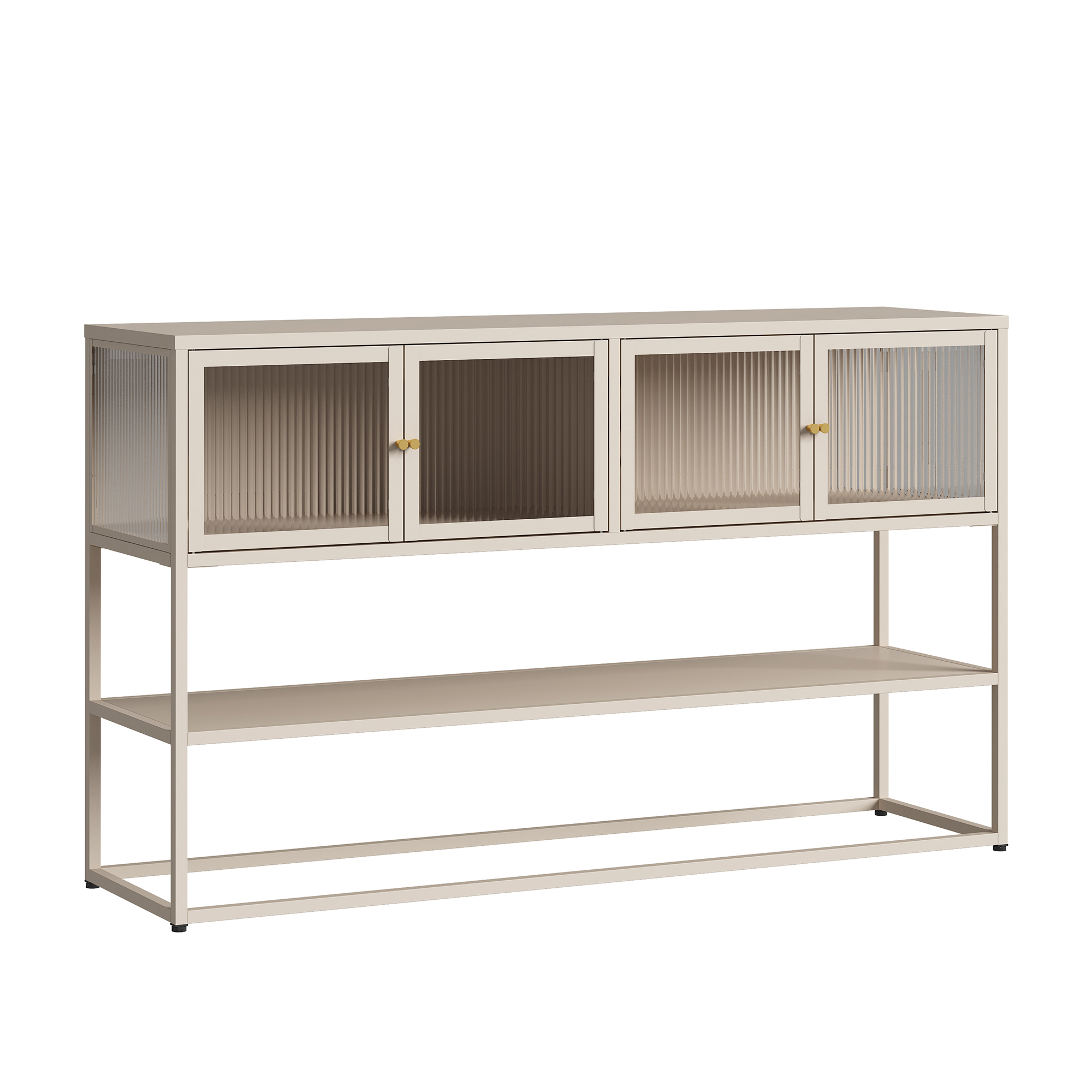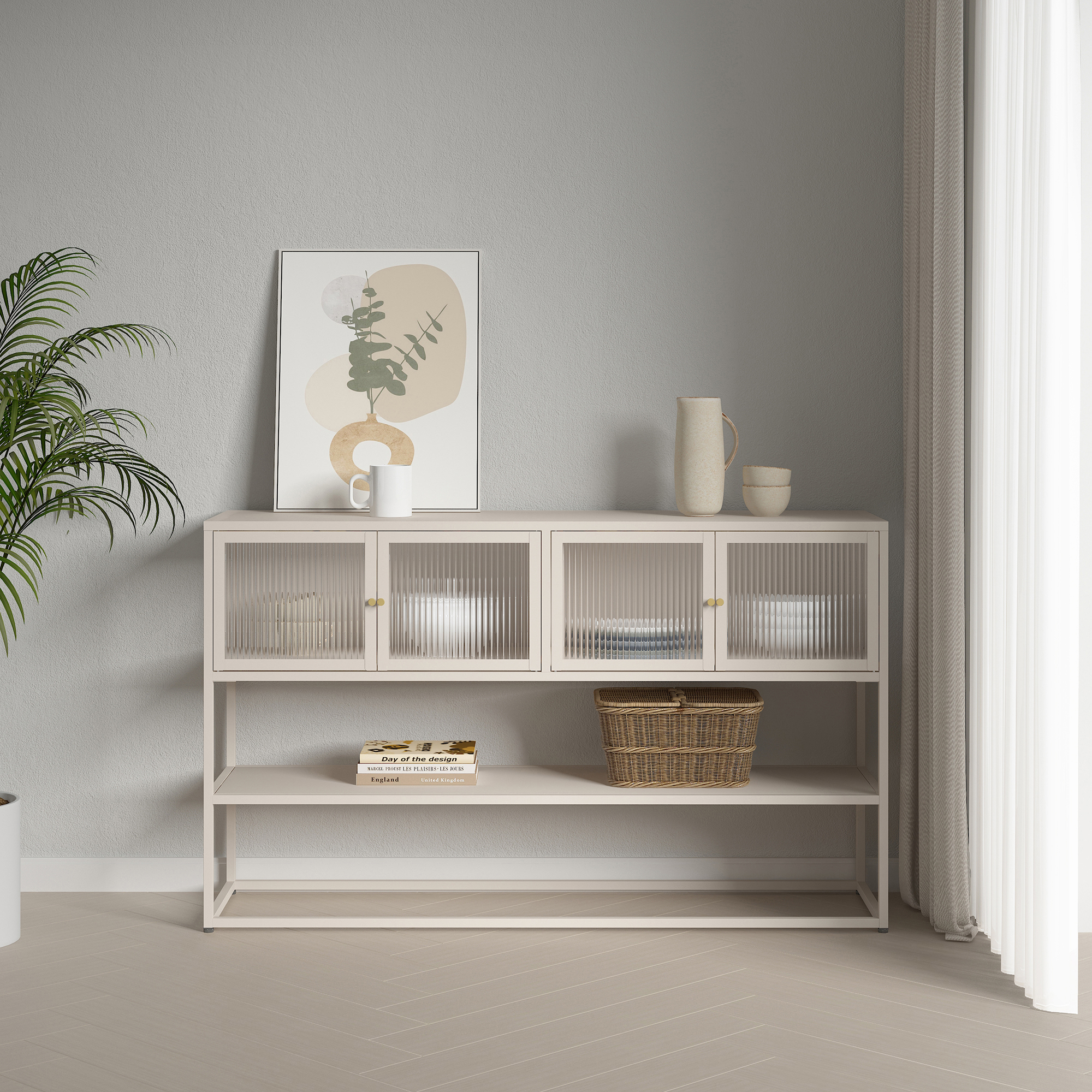 Die vier Schranktüren mit geriffelter Glasfront lassen sich dank der Griffe bequem öffnen und schließen. Der Magnetverschluss sorgt dafür, dass die Türen sanft und leise schließen.