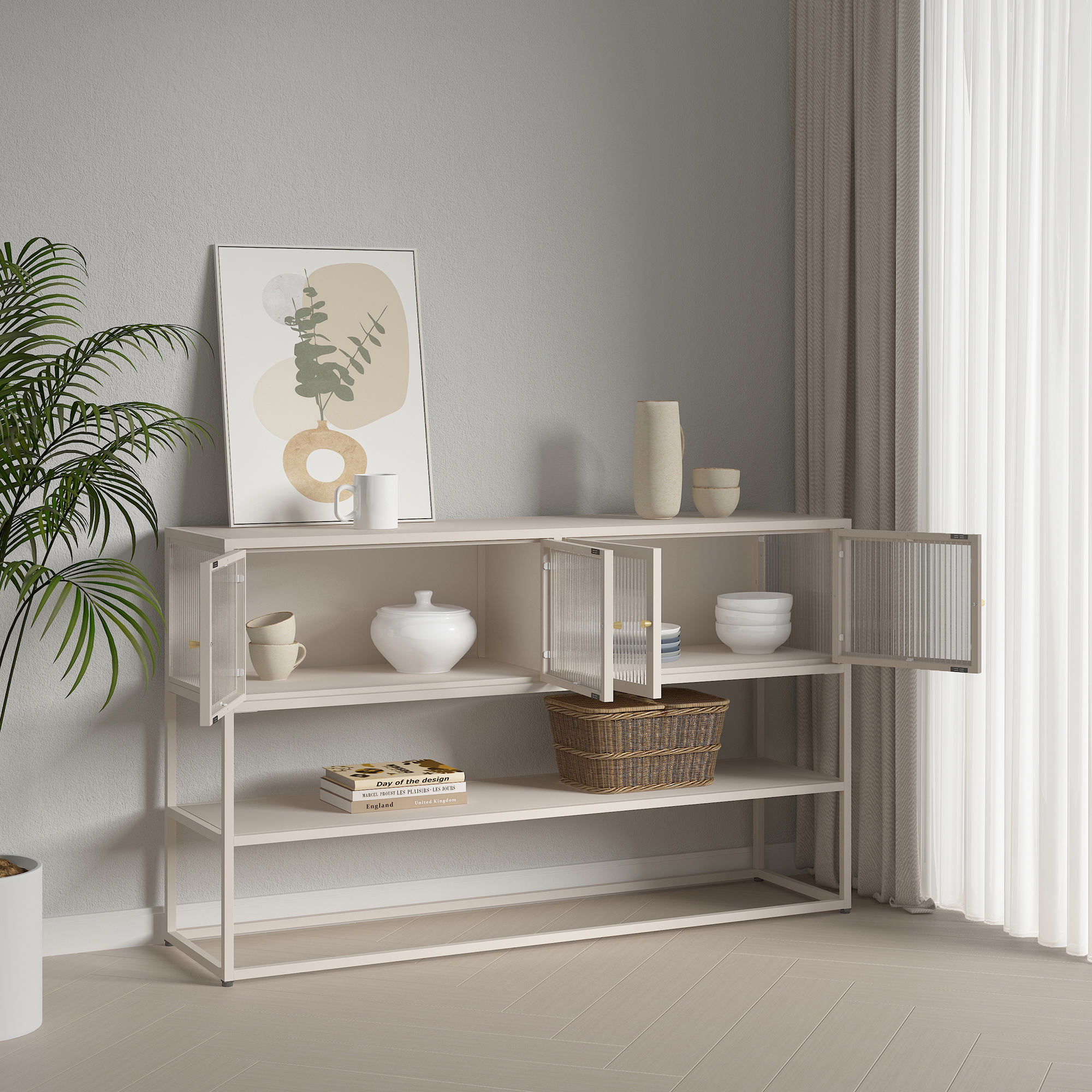 Das Sideboard eignet sich ideal zum Verstauen verschiedenster Gegenstände im Wohn- oder Essbereich. Die Oberfläche und die untere Ablage bieten Platz für Pflanzen und Dekorationen, während im Inneren Bücher, Geschirr und andere Utensilien übersichtlich und griffbereit aufbewahrt werden können.