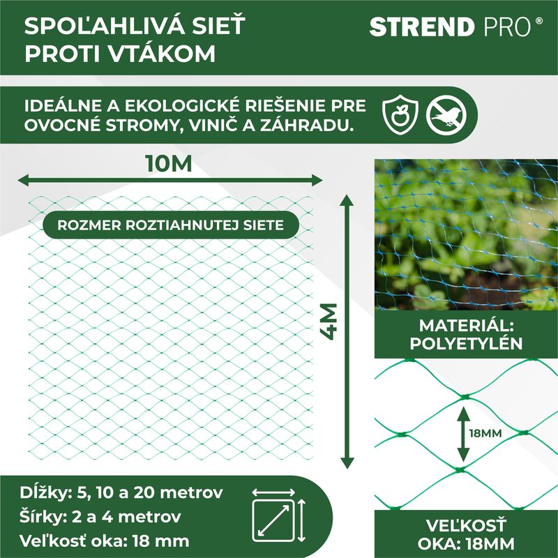Sieť Strend Pro je efektívnym riešenímna ochranu ovocných stromov, kríkov a viniča pred vtáctvom.Vďaka jemným okám a odolnému materiálu zabezpečuje spoľahlivú ochranu bez obmedzenia prístupu svetla a vzduchu k rastlinám.