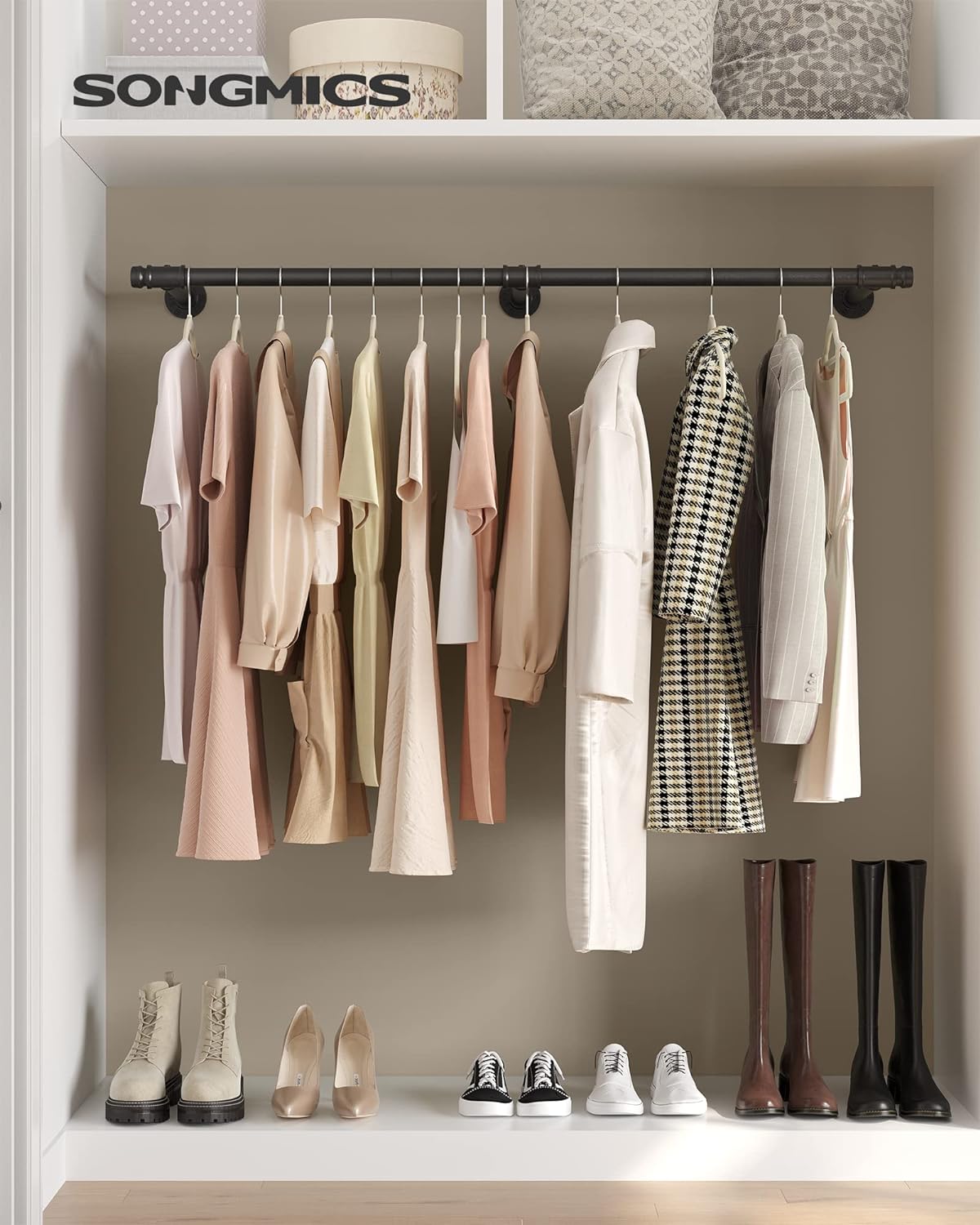 Organizeaza eficient hainele cu aceasta sina de haine pentru perete SONGMICS, realizata din otel rezistent si finisata in negru elegant. Cu un design de inspiratie industriala, este alegerea potrivita pentru dormitor, spalatorie, dressing, hol sau chiar pentru expunerea articolelor vestimentare in magazin. Montata pe perete, economiseste spatiu la sol si iti ofera o solutie practica pentru haine de zi cu zi, umerase, esarfe sau accesorii.