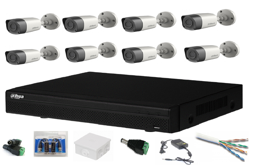 Sistem complet supraveghere cu 8 camere exterior Dahua CMOS 2MP, 3.6mm, Smart IR 20m, IP67, DVR 8 canale, accesorii montaj SafetyGuard Surveillance