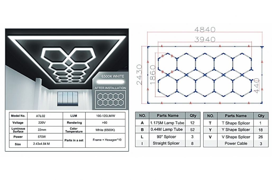 Acest sistem de iluminat este creat special pentru a oferi o iluminare excelenta, oferind si o atmosfera ce denota lux. Cu posibilitatea de a ajusta intensitatea luminii Cu sistemul sau personalizat de lumina tip fagure, conceput pentru a aduce un aspect modern si atractiv, spatiul va fi plutit cu o lumina impresionanta. Tuburile LED au o lumina rece de 6500K, fiecare panou oferind o intensitate de 110~120 lumen/watt si o putere de 540/650W Caracteristicile cheie includ: Eficienta energetica ridicata: sistemul utilizeaza tehnologia LED, oferind lumina puternica, uniforma si de lunga durata, reducand in acelasi timp consumul de energie Usor de instalat: sistemul este foarte simplu de instalat Durabilitate: Construite cu o constructie robusta si materiale de inalta calitate, aceste lumini sunt proiectate pentru a rezista cerintelor mediilor mai dure, cum ar fi garajele sau atelierele de reparatii. Estetica contemporana: Designul hexagonal adauga o nota moderna, minimalista, care sporeste profesionalismul si stilul oricarui spatiu. Design modular: luminile pot fi aranjate in diferite configuratii pentru a se potrivi diferitelor spatii si preferinte, fie ca tavan complet iluminat, fie ca iluminat de accent in zone specifice. Aceste lumini sunt ideale pentru a prezenta detalii complicate ale vehiculului, pentru a crea o ambianta primitoare in showroom-uri si pentru a imbunatati vizibilitatea in mediile de lucru. Caracteristici: Dimensiunea spatiului: 4,84 x 2,43 metri Dimensiunea ansamblului hexagonal: Lungime 3,94 m, Latime 1,86 m Model: Hexagon / Fagure Numar coloane: 5 Număr de randuri: 2 Specificatii tehnice pachet: Evaluare IP: IP44 Temperatura de culoare (CCT): 6500K (alb rece) Tensiune de intrare (V): 240V/220V/110V AC Culoare care emite: Lumina zilei Lumen: 110~120lm/watt Putere: 540w/650w Material: Aluminiu + PC