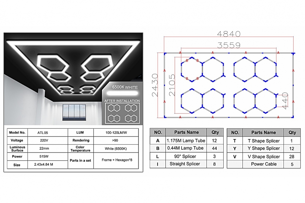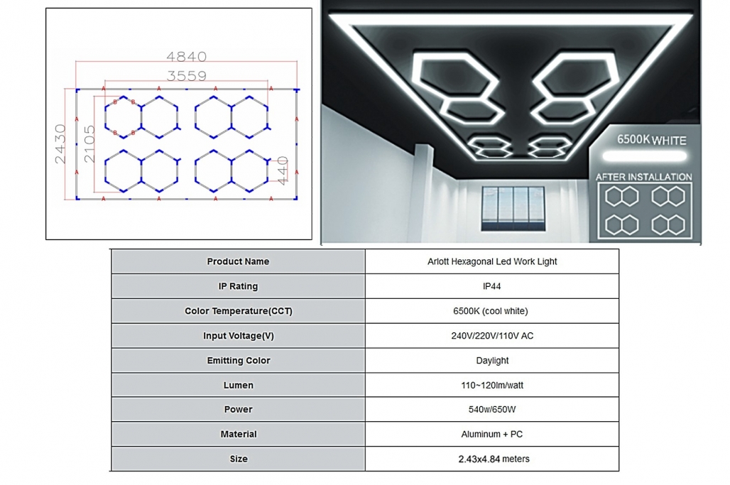 Acest sistem de iluminat este creat special pentru a oferi o iluminare excelenta, oferind si o atmosfera ce denota lux. Cu sistemul sau personalizat de lumina tip fagure, conceput pentru a aduce un aspect modern si atractiv, spatiul va fi plutit cu o lumina impresionanta. Tuburile LED au o lumina rece de 6500K, fiecare panou oferind o intensitate de 110~120 lumen/watt si o putere de 540/650W Caracteristicile cheie includ: Eficienta energetica ridicata: sistemul utilizeaza tehnologia LED, oferind lumina puternica, uniforma si de lunga durata, reducand in acelasi timp consumul de energie Usor de instalat: sistemul este foarte simplu de instalat Durabilitate: Construite cu o constructie robusta si materiale de inalta calitate, aceste lumini sunt proiectate pentru a rezista cerintelor mediilor mai dure, cum ar fi garajele sau atelierele de reparatii. Estetica contemporana: Designul hexagonal adauga o nota moderna, minimalista, care sporeste profesionalismul si stilul oricarui spatiu. Design modular: luminile pot fi aranjate in diferite configuratii pentru a se potrivi diferitelor spatii si preferinte, fie ca tavan complet iluminat, fie ca iluminat de accent in zone specifice. Aceste lumini sunt ideale pentru a prezenta detalii complicate ale vehiculului, pentru a crea o ambianta primitoare in showroom-uri si pentru a imbunatati vizibilitatea in mediile de lucru. Caracteristici: Dimensiunea spatiului: 4,84 x 2,43 metri Dimensiune ansamblu hexagonal: Lungime 3.559 m, Latime 2.10,5 m Model: Hexagon / Fagure 4 grupuri de 2 hexagoane Specificatii tehnice pachet: Evaluare IP: IP44 Temperatura de culoare (CCT): 6500K (alb rece) Tensiune de intrare (V): 240V/220V/110V AC Culoare care emite: Lumina zilei Lumen: 110~120lm/watt Putere: 540w/650w Material: Aluminiu + PC