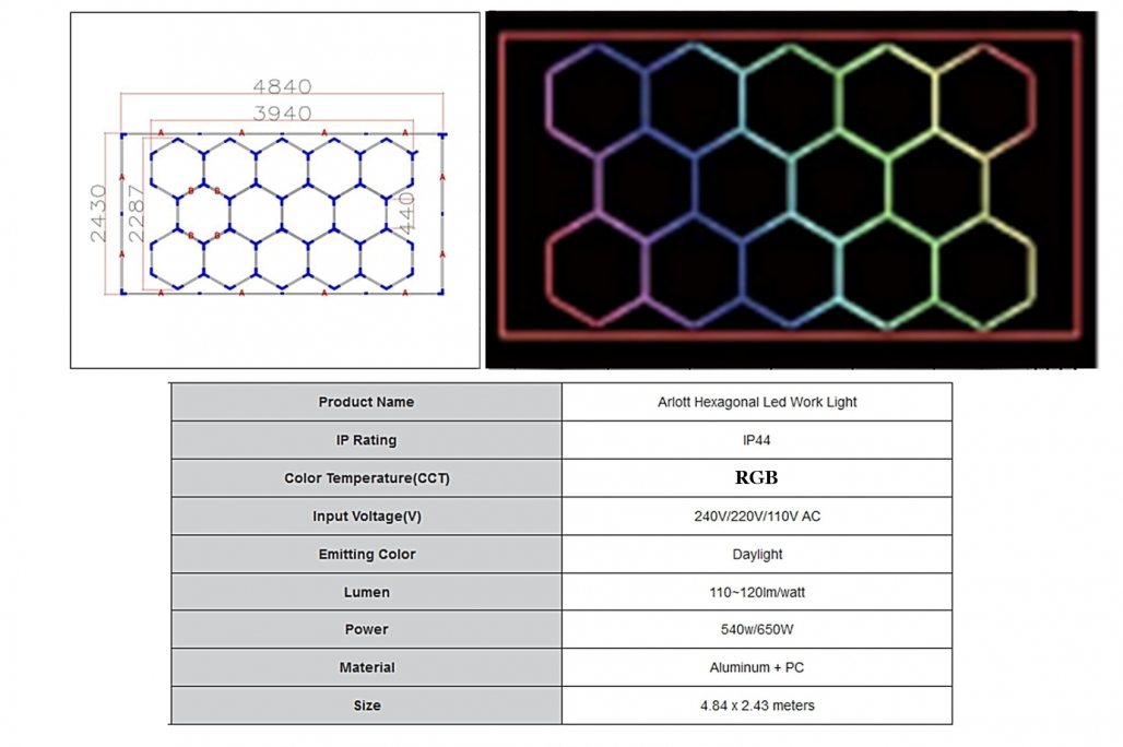 Acest sistem de iluminat este creat special pentru a oferi o iluminare excelenta, oferind si o atmosfera ce denota lux. Cu posibilitatea de a regla culoarea luminii cu telecomanda ai aplicatie. Cu sistemul sau personalizat de lumina tip fagure, conceput pentru a aduce un aspect modern si atractiv, spatiul va fi plutit cu o lumina impresionanta. Tuburile LED au o lumina rece de 6500K, fiecare panou oferind o intensitate de 110~120 lumen/watt si o putere de 540/650W Caracteristicile cheie includ: Eficienta energetica ridicata: sistemul utilizeaza tehnologia LED, oferind lumina puternica, uniforma si de lunga durata, reducand in acelasi timp consumul de energie Usor de instalat: sistemul este foarte simplu de instalat Durabilitate: Construite cu o constructie robusta si materiale de inalta calitate, aceste lumini sunt proiectate pentru a rezista cerintelor mediilor mai dure, cum ar fi garajele sau atelierele de reparatii. Estetica contemporana: Designul hexagonal adauga o nota moderna, minimalista, care sporeste profesionalismul si stilul oricarui spatiu. Design modular: luminile pot fi aranjate in diferite configuratii pentru a se potrivi diferitelor spatii si preferinte, fie ca tavan complet iluminat, fie ca iluminat de accent in zone specifice. Aceste lumini sunt ideale pentru a prezenta detalii complicate ale vehiculului, pentru a crea o ambianta primitoare in showroom-uri si pentru a imbunatati vizibilitatea in mediile de lucru. Caracteristici: Dimensiunea spatiului: 4,84 x 2,43 metri Dimensiunea ansamblului hexagonal: Lungime 4,567 m, Latime 2,294 m Model: Hexagon / Fagure Număr de coloane: 2 din 5 hexagoane și 1 din 4 hexagoane Număr de randuri: 3 Specificatii tehnice pachet: Evaluare IP: IP44 Temperatura de culoare (CCT): RGB Tensiune de intrare (V): 240V/220V/110V AC Culoare care emite: Lumina zilei Lumen: 110~120lm/watt Putere: 540w/650w Material: Aluminiu + PC
