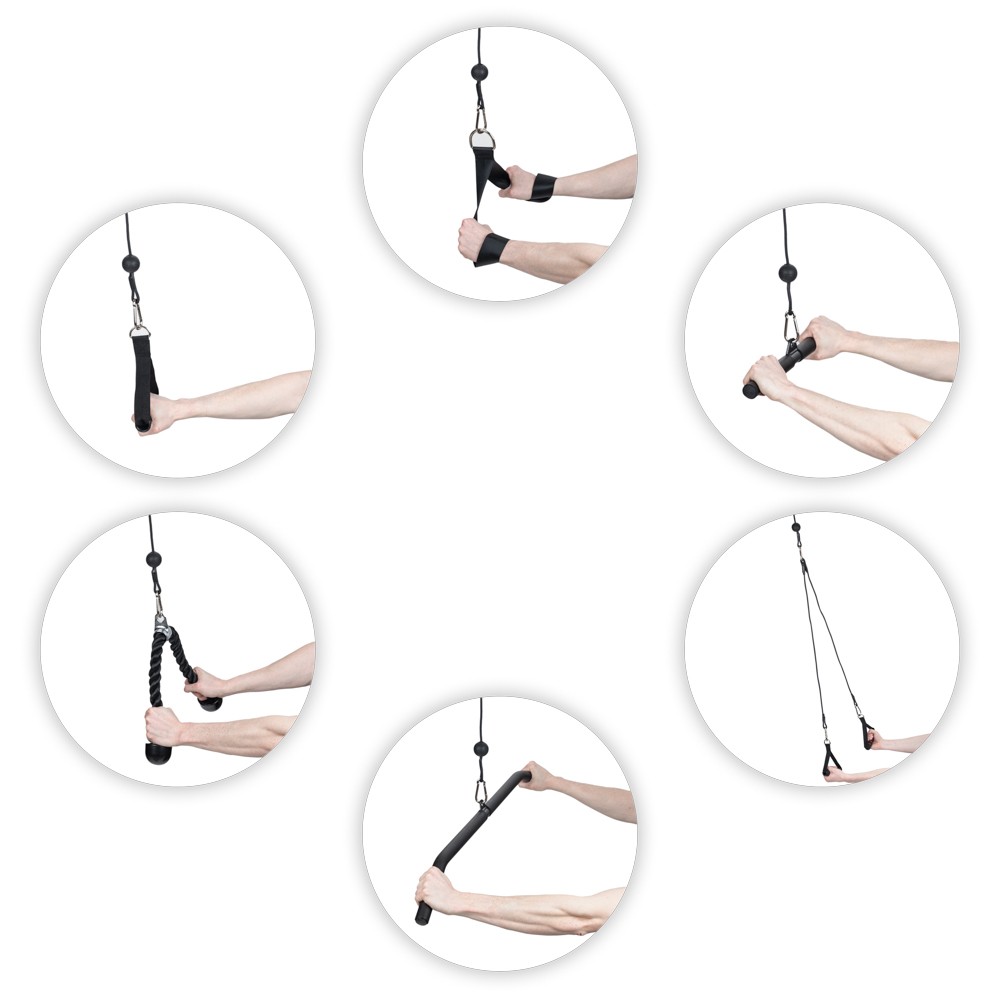 Sistemul de suspensie cu scripeti cu cablu inSPORTline Puley 500 vine cu o varietate de extensii pentru un antrenament versatil. Datorita constructiei solide din otel a scripetilor si a cablurilor din otel, sistemul poate sustine o sarcina de pana la 160 kg. Cu o inaltime de 19 cm si un diametru de 1 cm, cuierul de incarcare este compatibil cu toate tipurile de placi de greutate cu gauri de diferite dimensiuni; opritorul de 8 cm va fixa placile la locul lor. In set mai sunt incluse bara lunga si curbata, bara dreapta mica, manerele cu cabluri pentru o singura mana, cureaua si franghia cu capete din cauciuc pentru intarirea tricepsului, manerul pentru o singura mana si doua cabluri de diferite lungimi cu dopuri de cauciuc. Sistemul multifunctional de scripeti cu cablu de suspensie inSPORTline Puley 500 ofera o experienta incredibila de antrenament la domiciliu, facandu-va sa va simtiti ca intr-o sala de gimnastica profesionala.