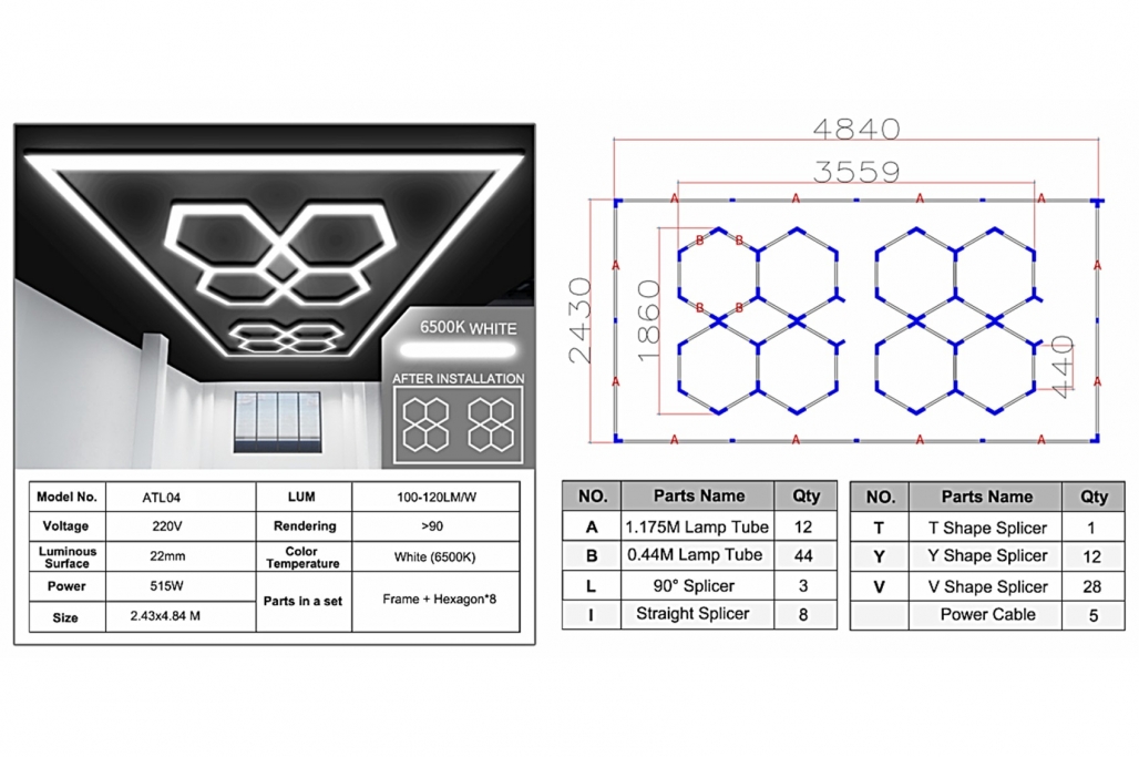 Transforma orice garaj, atelier sau showroom intr-un spatiu modern cu acest sistem de iluminare plafon hexagonal LED. Designul tip fagure ofera un impact vizual deosebit, iar lumina ajustabila si temperatura de culoare de 6500K asigura vizibilitate excelenta pentru lucru, prezentare auto sau detailing.
