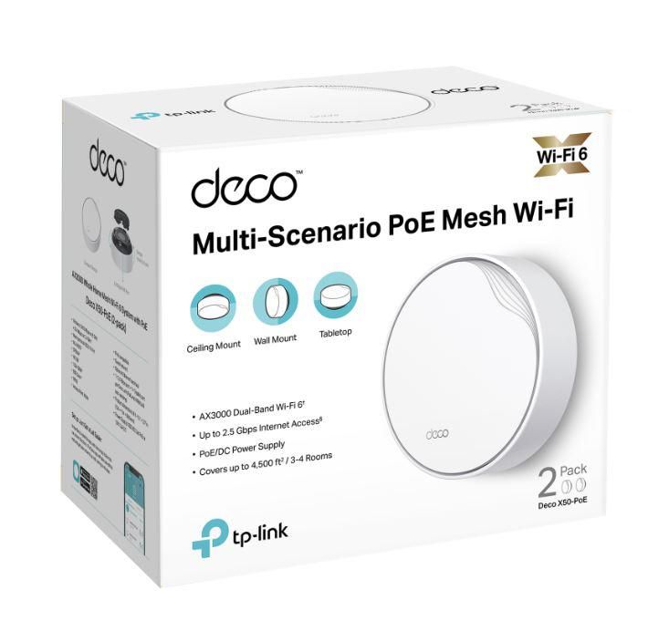 Deco X50-PoE este proiectat sa utilizeze un singur cablu Ethernet atat pentru transmisia de date, cat si pentru alimentarea cu energie. De asemenea, accepta sursa de alimentare DC (cablu de alimentare inclus) pentru instalatii flexibile.