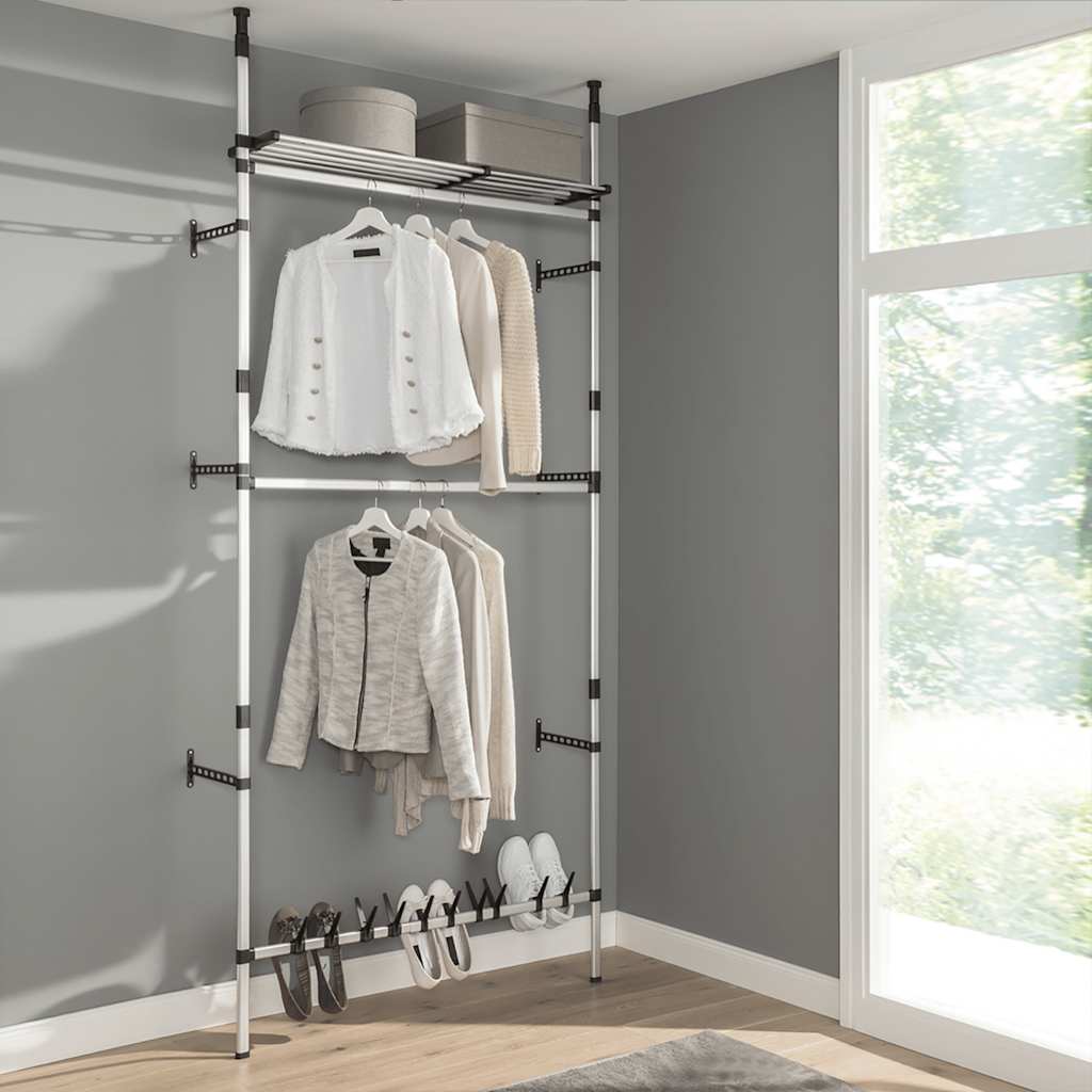 Sistemul telescopic pentru garderobă este fabricat din aluminiu, fiind rezistent și robust. Această poliță de depozitare poate fi ajustată pentru diferite aranjamente spațiale, datorită sistemului său telescopic, înălțimii și lățimii reglabile. Oferă un mijloc unic și ingenios de a vă organiza dulapul.