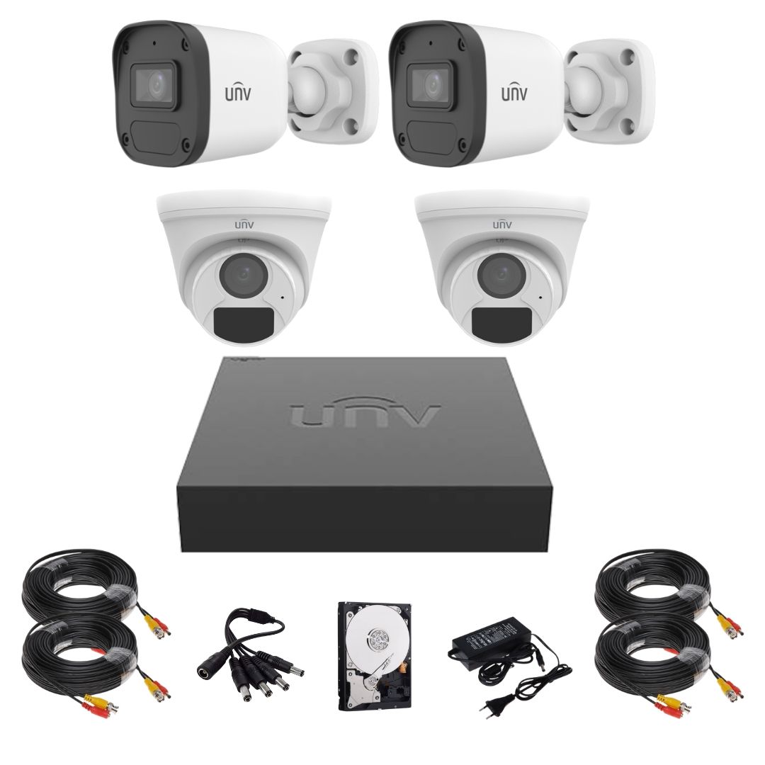 Sistem supraveghere complet Uniview, 2 camere de exterior, 2 camere de interior, 2MP, IR 20m, microfon, DVR, Accesorii montaj SafetyGuard Surveillance