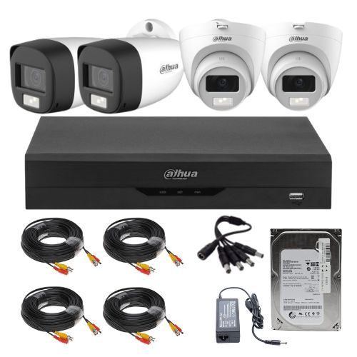 Sistemul de supraveghere Dahua cu 4 camere 2MP este o solutie practica si eficienta pentru protectia locuintei, biroului, magazinului sau altor spatii comerciale. Pachetul include 2 camere bullet cu infrarosu 20 m, 2 camere dome cu Dual Light, microfon integrat, un DVR Dahua 4 canale, HDD de 500GB si accesoriile necesare pentru instalare. Beneficiezi de imagini Full HD clare, monitorizare audio-video si acces facil de la distanta prin aplicatia DMSS.