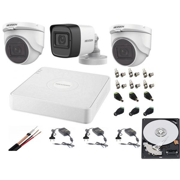 Sistem supraveghere Hikvision cu 3 camere audio 2MP, DVR 4 canale, HDD 500GB