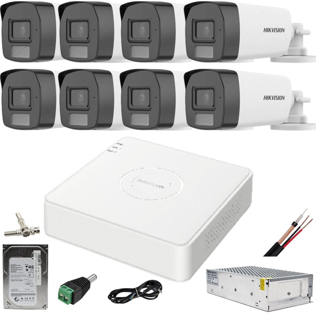 Alege un sistem de supraveghere Hikvision complet, pregatit pentru instalare, potrivit pentru locuinte, curti, magazine, birouri sau hale. Kitul include 8 camere 2MP cu microfon incorporat, tehnologie Dual Light pentru imagini clare zi si noapte, plus DVR 8 canale si HDD 1TB pentru stocare. Este o solutie practica pentru cei care vor monitorizare eficienta, imagini color pe timp de noapte si inregistrare stabila.