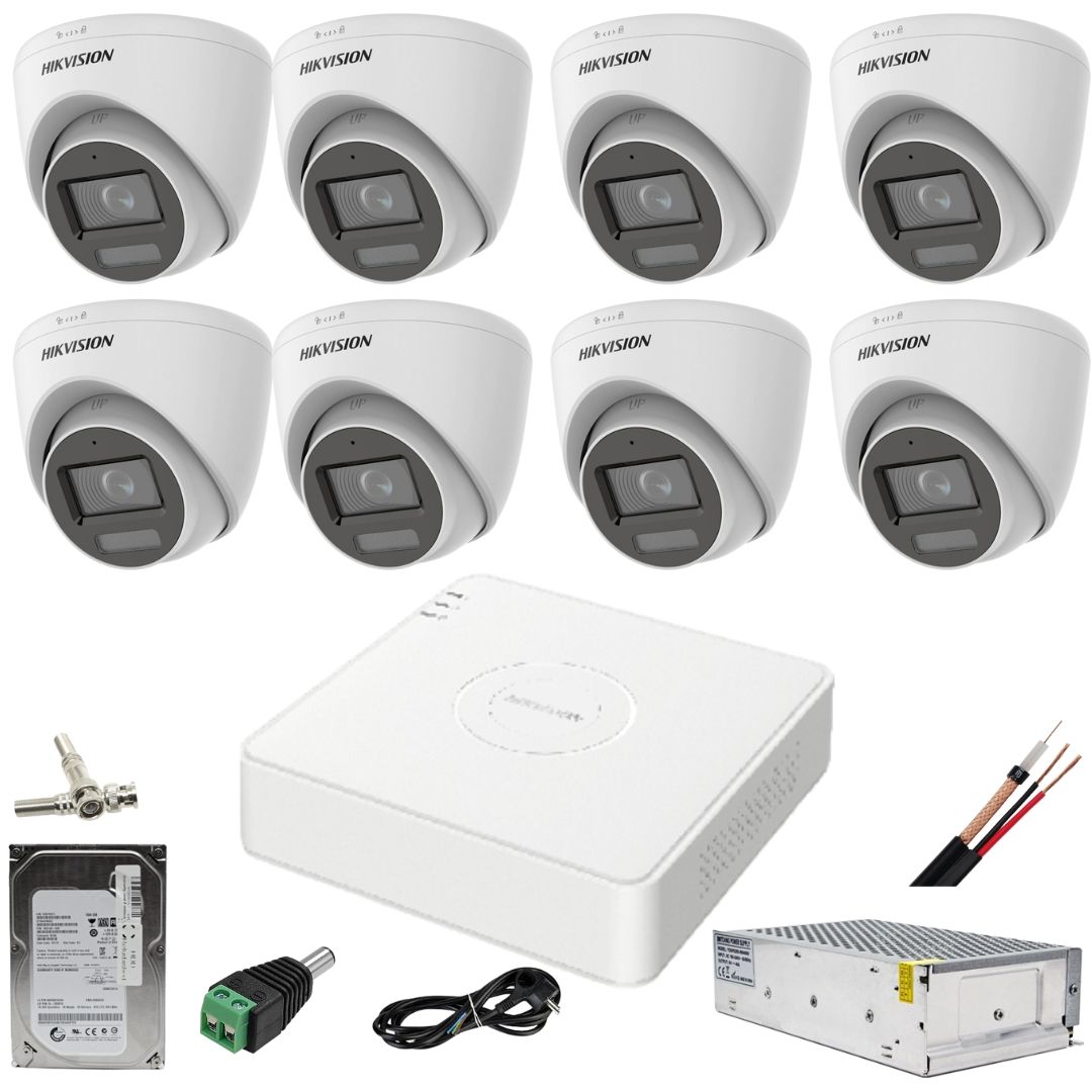 Sistem supraveghere Hikvision cu 8 camere 5MP Dual Light si HDD 1TB