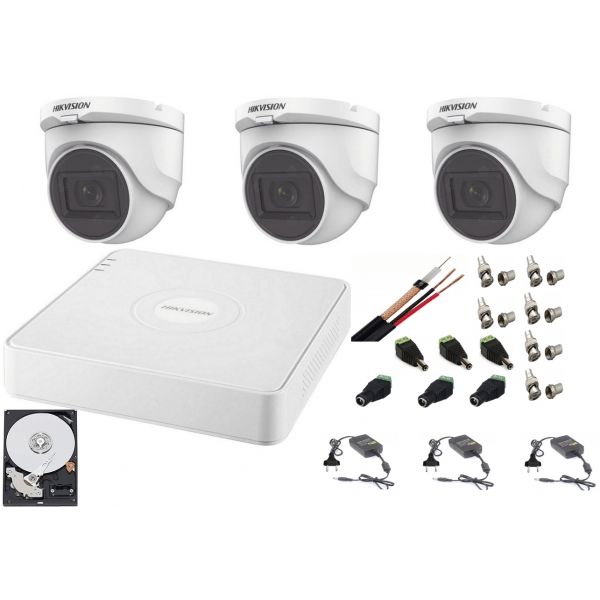 Sistem supraveghere interior Hikvision cu 3 camere 2MP audio, DVR și HDD 500GB