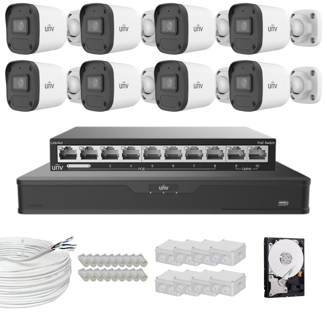 - 8 x Camere IP 4MP, lentila 2.8mm, Smart IR 30m, Mic, PoE, IP67- UNV IPC2124LB-AF28-ECO
