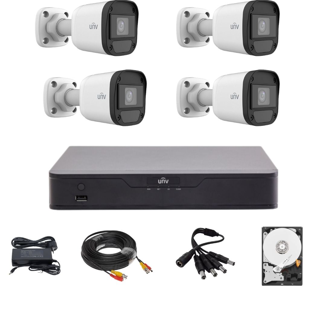 Alege un sistem de supraveghere Uniview complet, pregatit pentru protectia locuintei, biroului, magazinului sau spatiilor exterioare. Kitul include 4 camere de supraveghere 5MP, DVR hibrid 4 canale, cabluri, sursa, splitter si HDD 500GB, pentru instalare rapida si monitorizare eficienta zi si noapte.