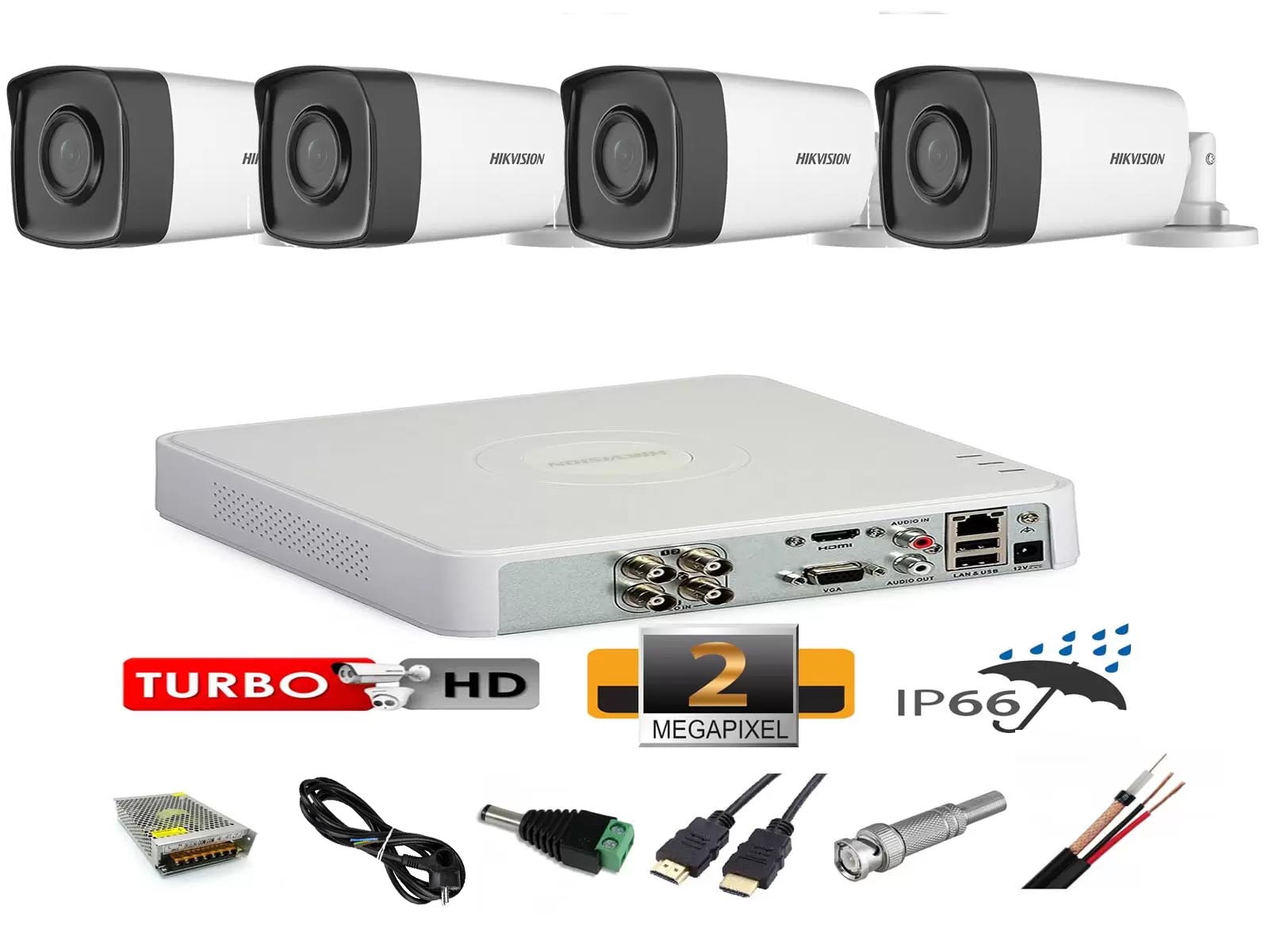 Alege un sistem supraveghere video exterior Hikvision pregatit pentru monitorizare eficienta a locuintei, curtii, magazinului sau firmei. Kitul include 4 camere bullet de 2MP Full HD, DVR Hikvision si accesoriile necesare pentru instalare, fiind o solutie practica pentru supraveghere clara, zi si noapte. Datorita iluminarii IR de pana la 40 m si protectiei la intemperii, sistemul este potrivit pentru utilizare la exterior in conditii variate.