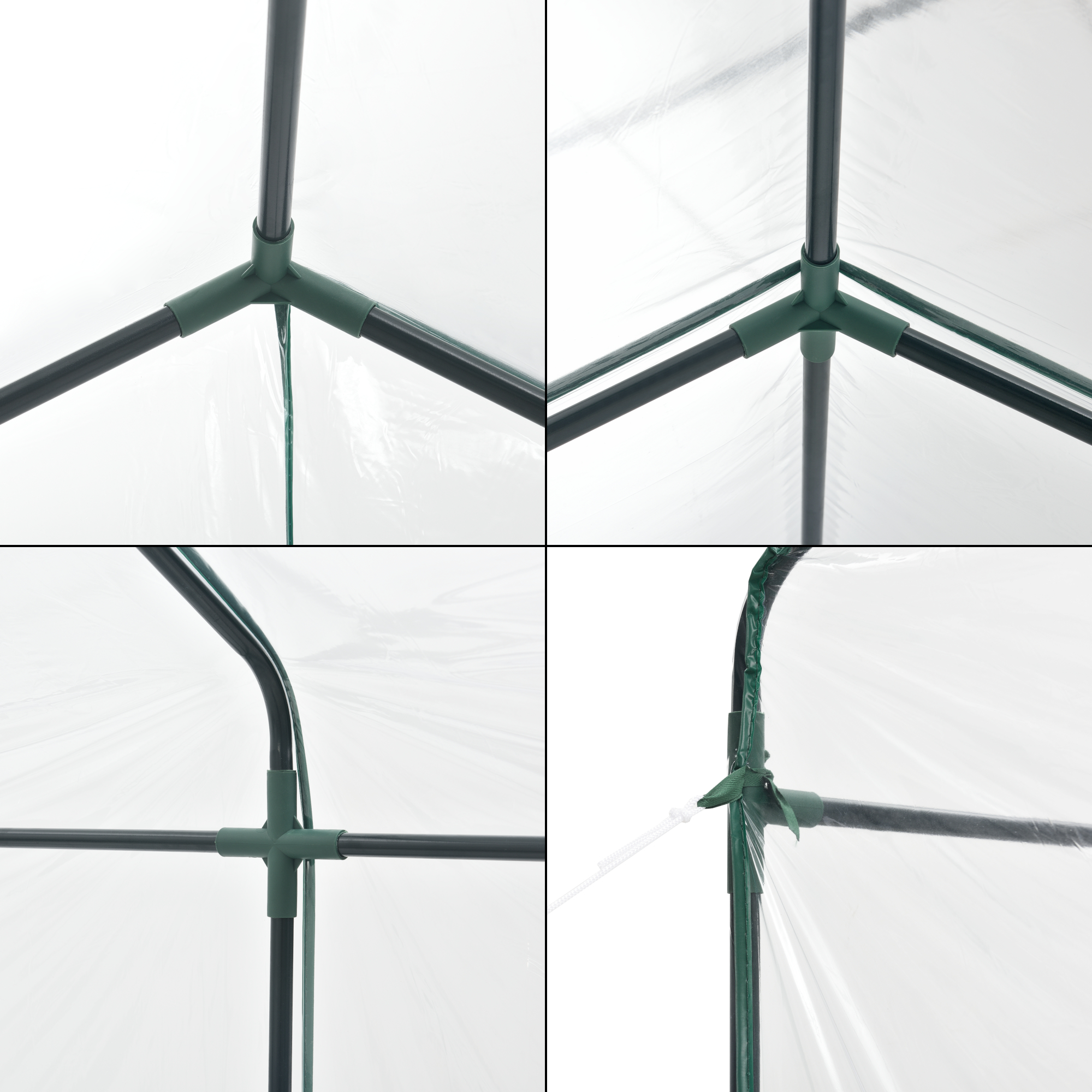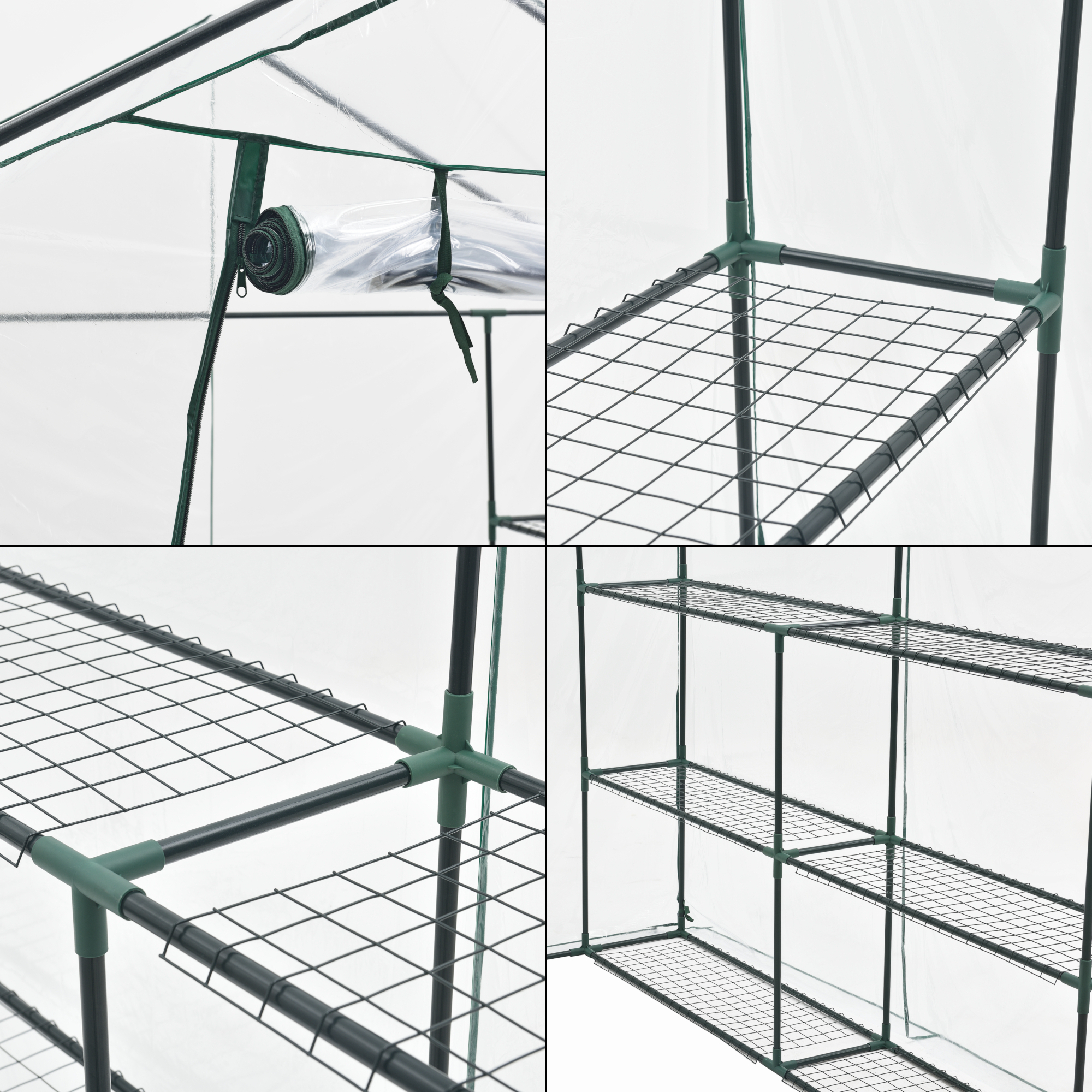 Datorita structurii tip tunel cu acoperis in doua ape, apa de ploaie se scurge eficient, iar interiorul ramane mai bine organizat. Folia transparenta din PVC permite patrunderea luminii naturale, iar usa rulabila cu fermoar ajuta la acces rapid si la o ventilatie optima. In plus, rafturile laterale ofera spatiu util pentru ghivece, tavi de rasaduri sau plante decorative.