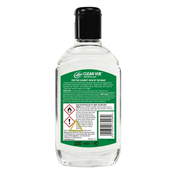 Cu Turtle Wax ClearVue Rain Repellent pe parbrizul masinii, nu mai este nevoie sa folosesti stergatoarele de parbriz atunci cand ploua in timpul condusului. Apa si picaturile de ploaie se scurg de pe parbriz datorita proprietatilor sale hidrofobe. Cu Turtle Wax ClearVue Rain Repellent, iti imbunatatesti si vizibilitatea si astfel siguranta in timpul condusului.
