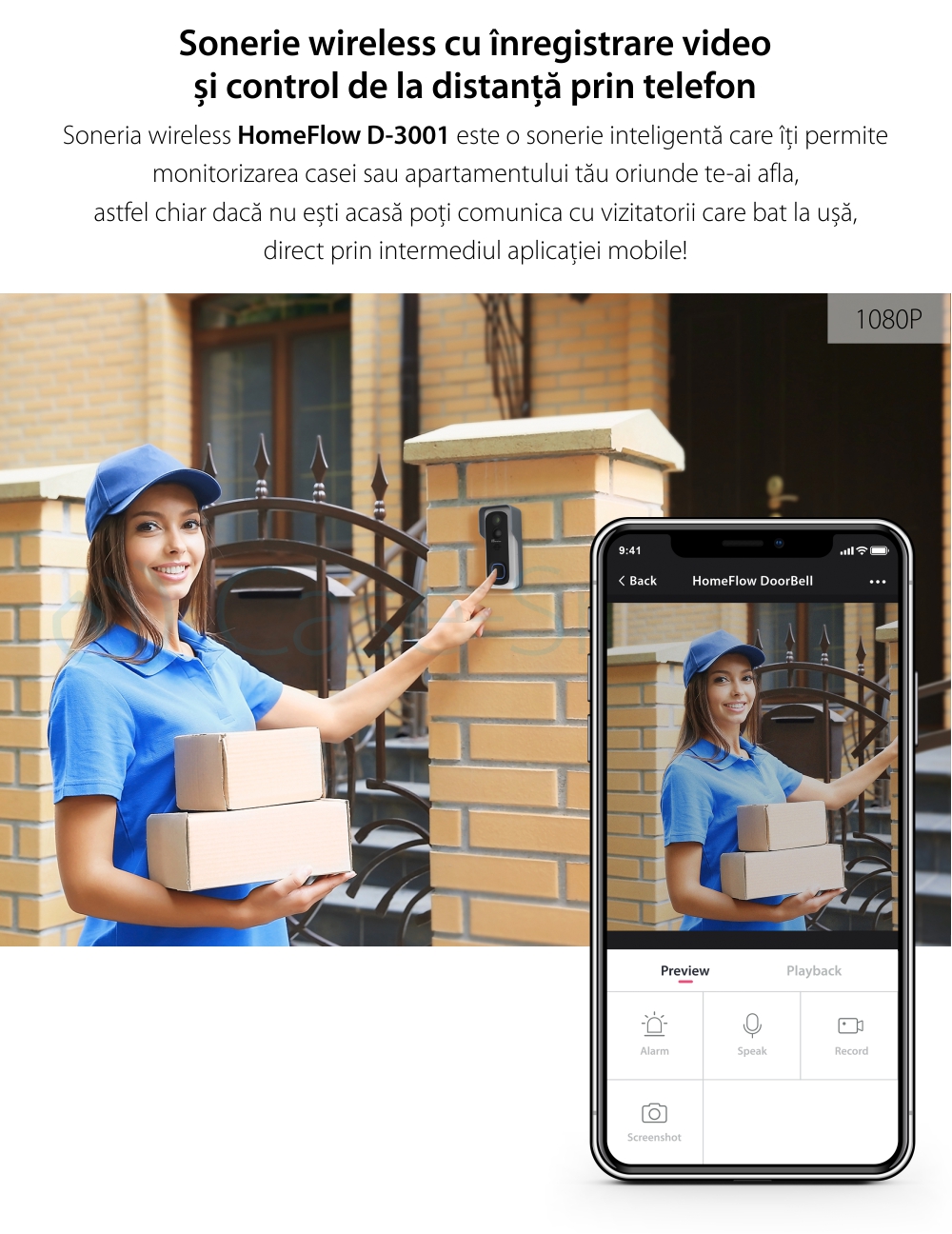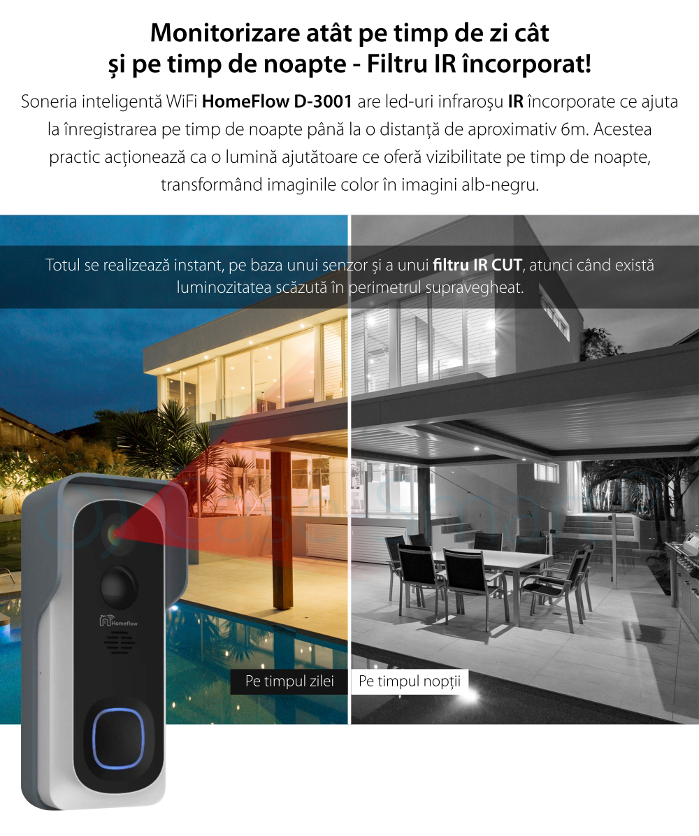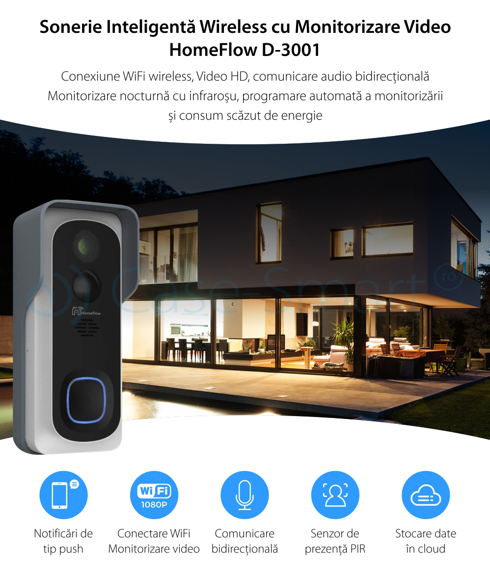 Sonerie inteligenta wireless cu monitorizare video Homeflow D-3001, Comunicare bidirectionala, Detectie miscare, Notificari, Modul sonerie interior inclus SmartElectro IntelligentHouse