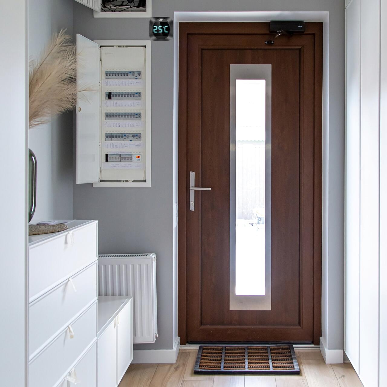 - Un alt mare avantaj al soneriei este afisajul pe care se poate vedea temperatura. Receptorul poate afisa temperatura in Celsius sau Fahrenheit. Schimbarea scalei este posibila dupa apasarea butonului.