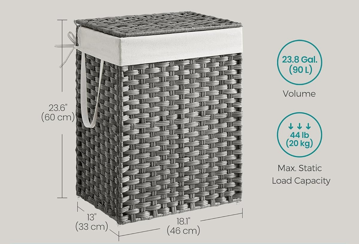 SONGMICS Cos rufe cu capac, ratan sintetic si sac detasabil, 90 L, 46x33x60 cm, gri Household NewTrend