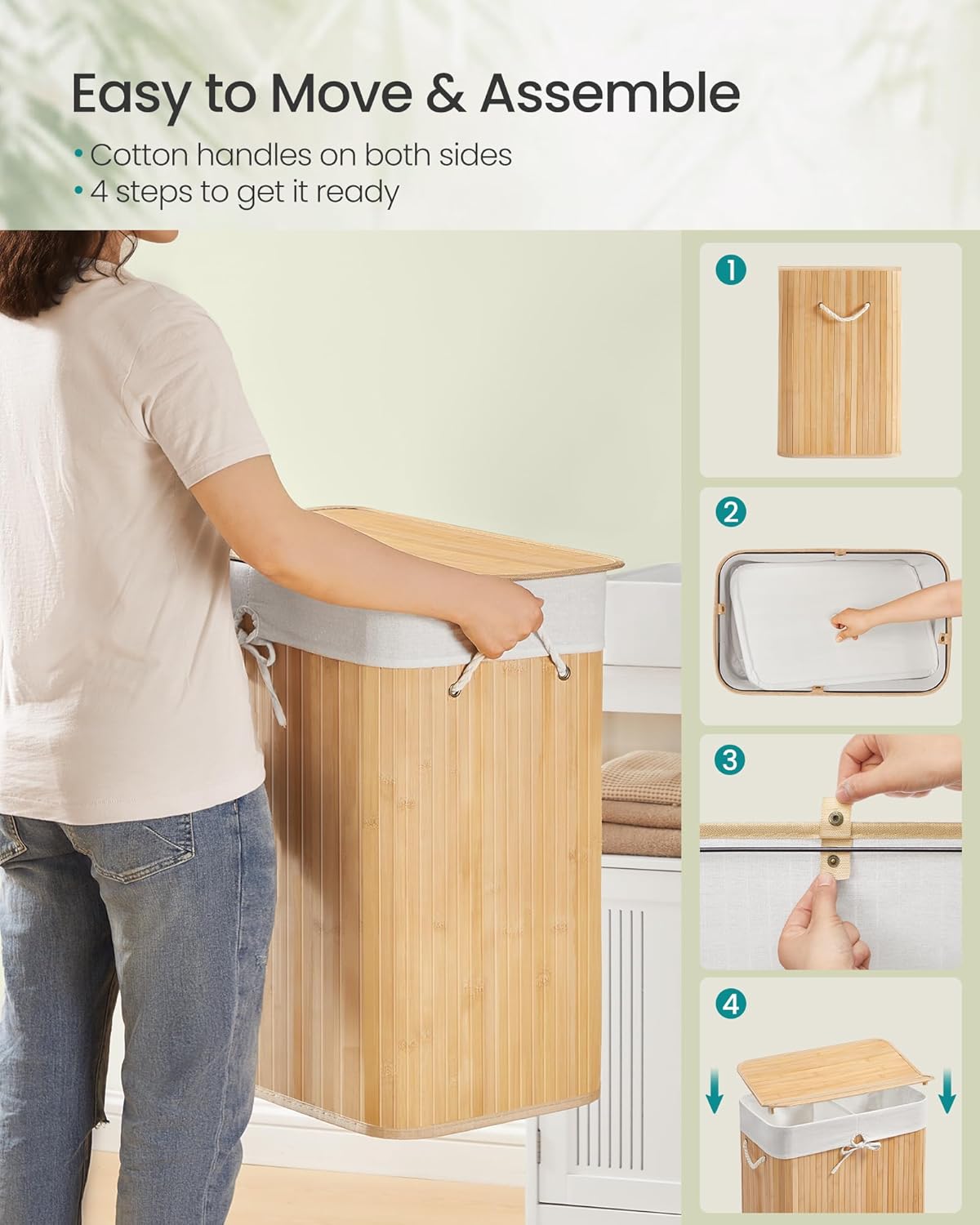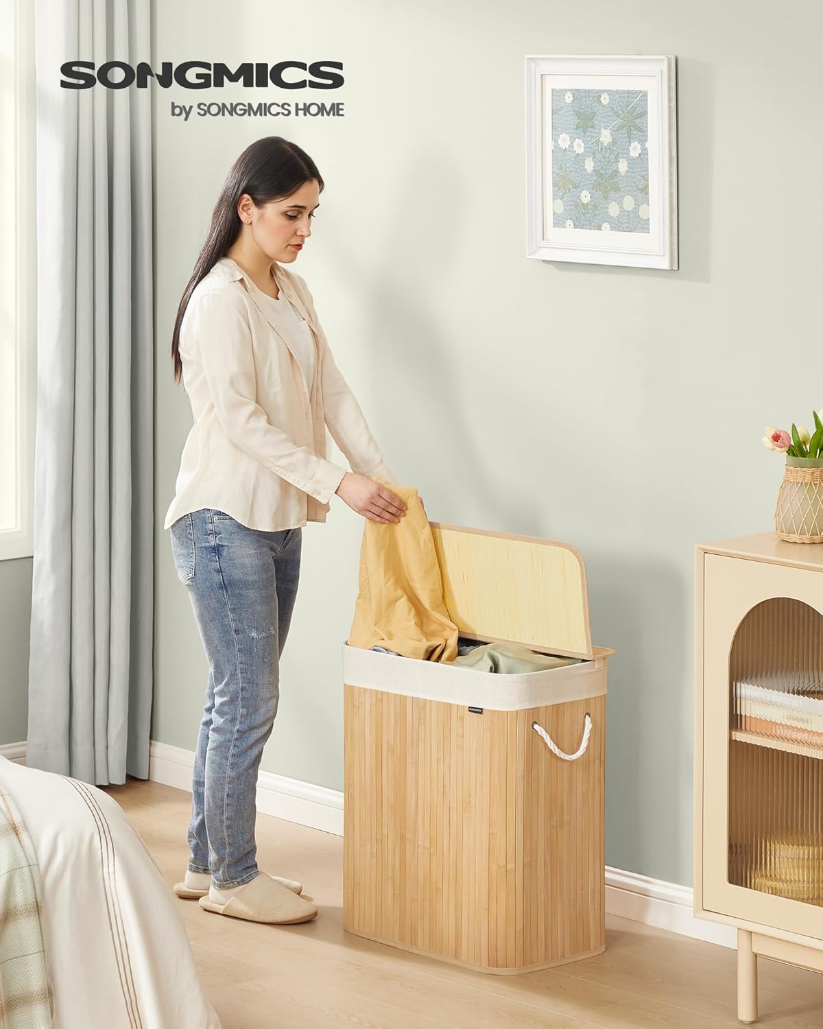 SONGMICS Cos rufe din bambus cu 2 compartimente, sac detasabil, 100 litri, 52x32x61 cm, maro natur Household NewTrend