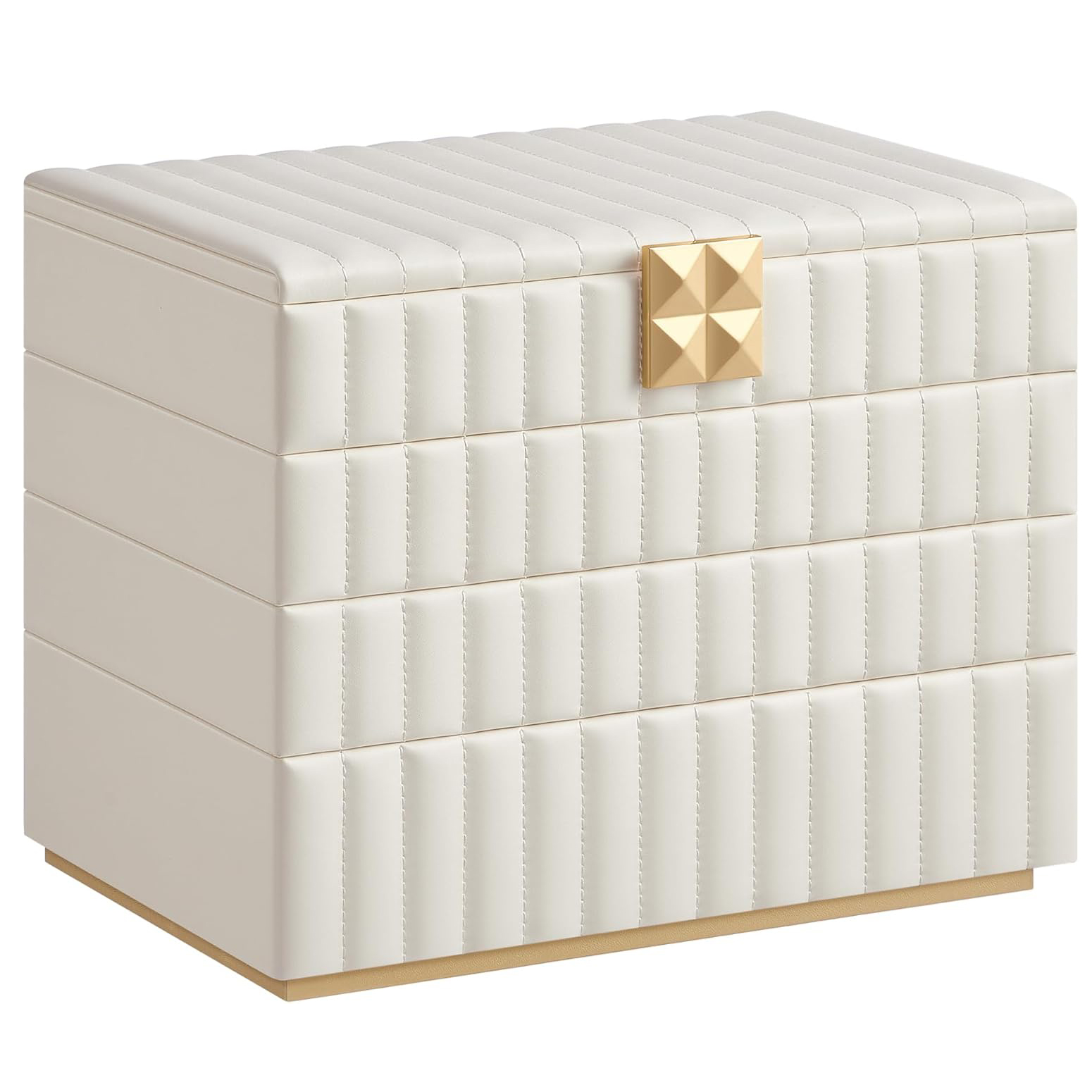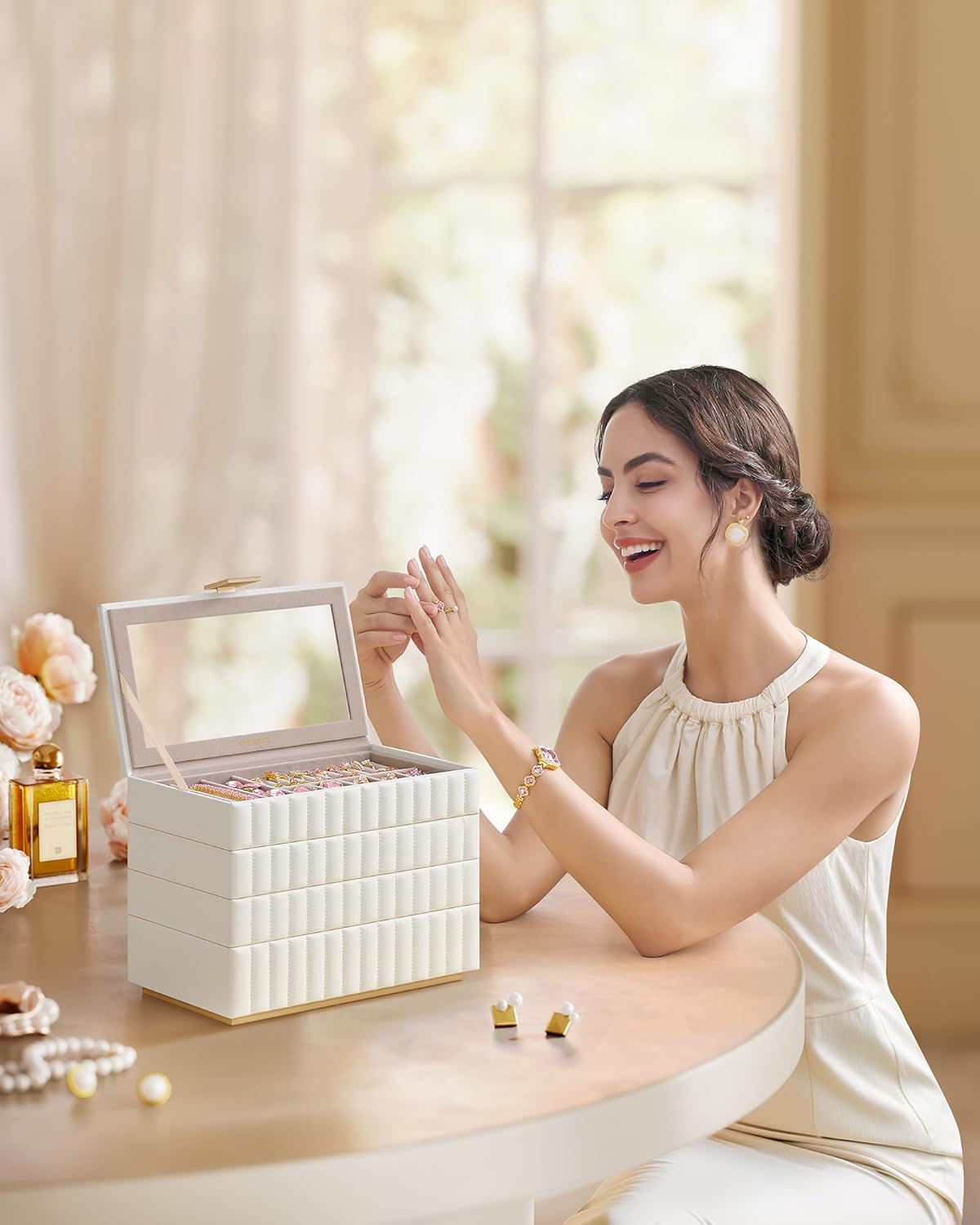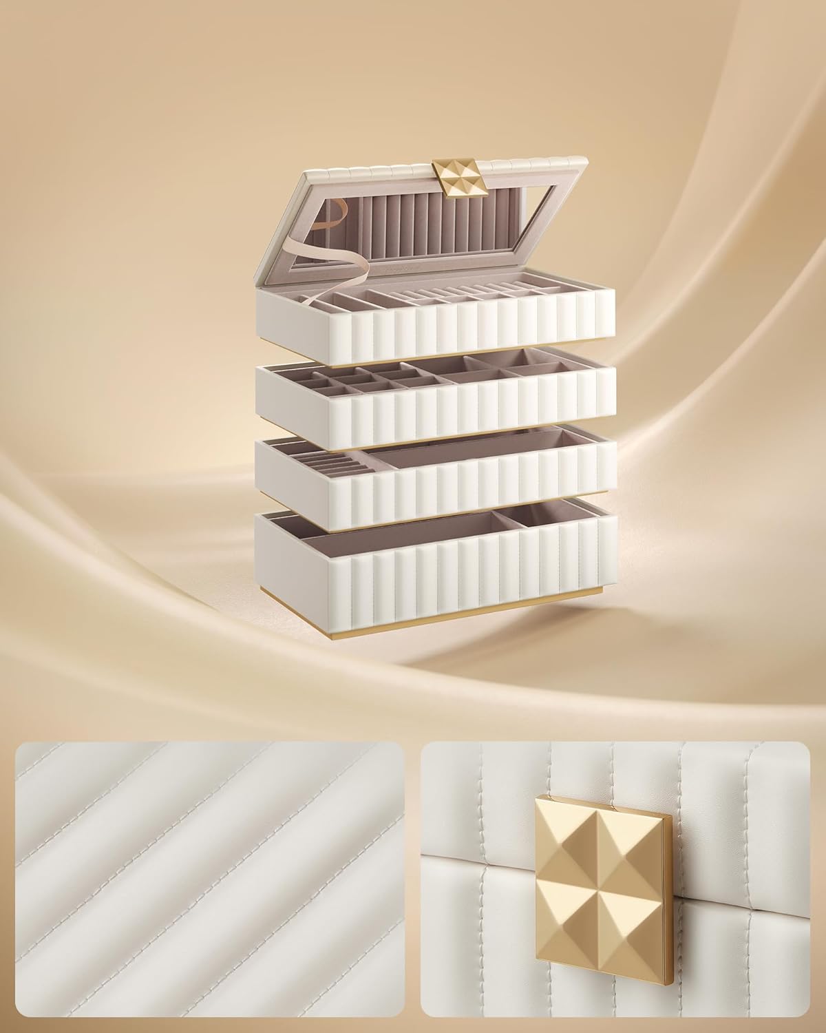 SONGMICS Cutie bijuterii 17x28x21 cm, 4 niveluri, oglinda, captuseala catifea, piele PU alba Household NewTrend