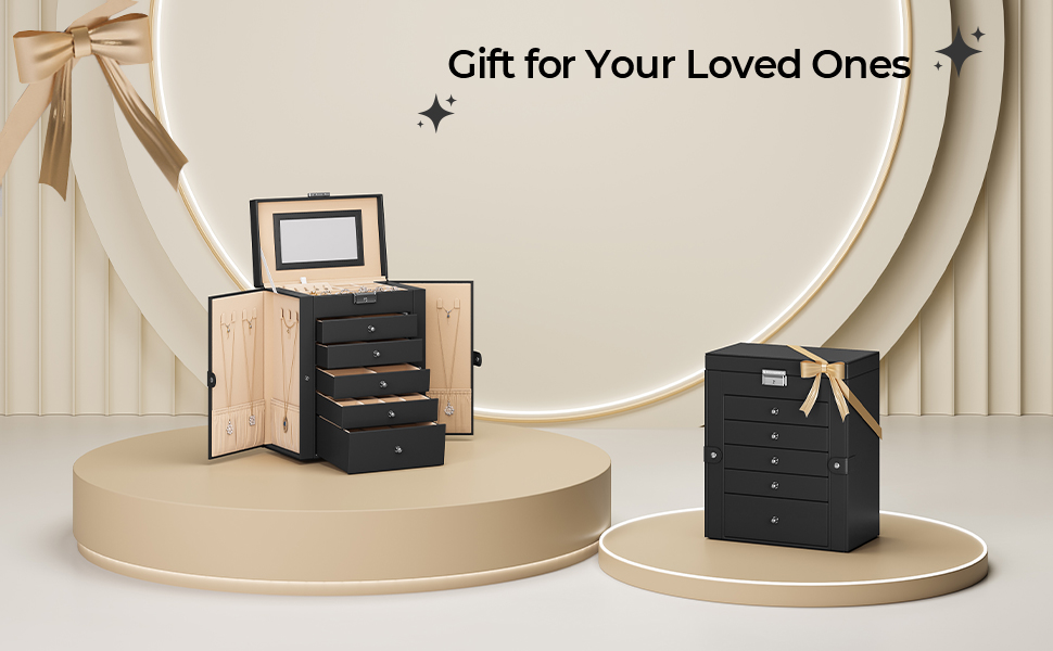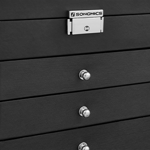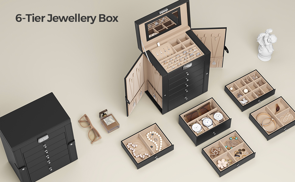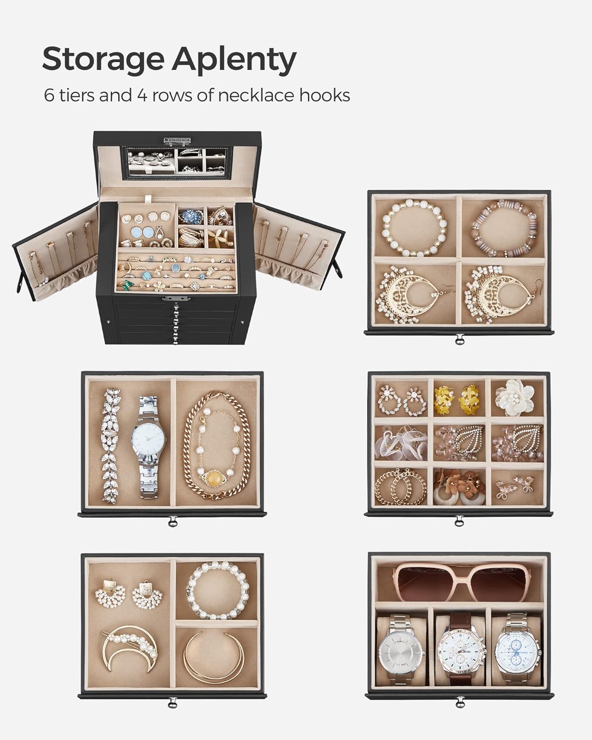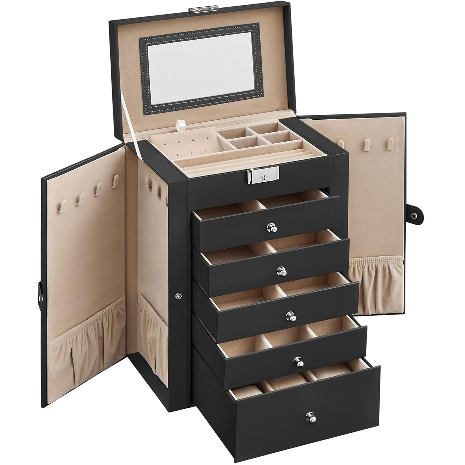 SONGMICS Cutie de bijuterii 6 nivele, 5 sertare, oglinda, suport ceasuri, incuietoare, 16x26x32cm, negru Household NewTrend