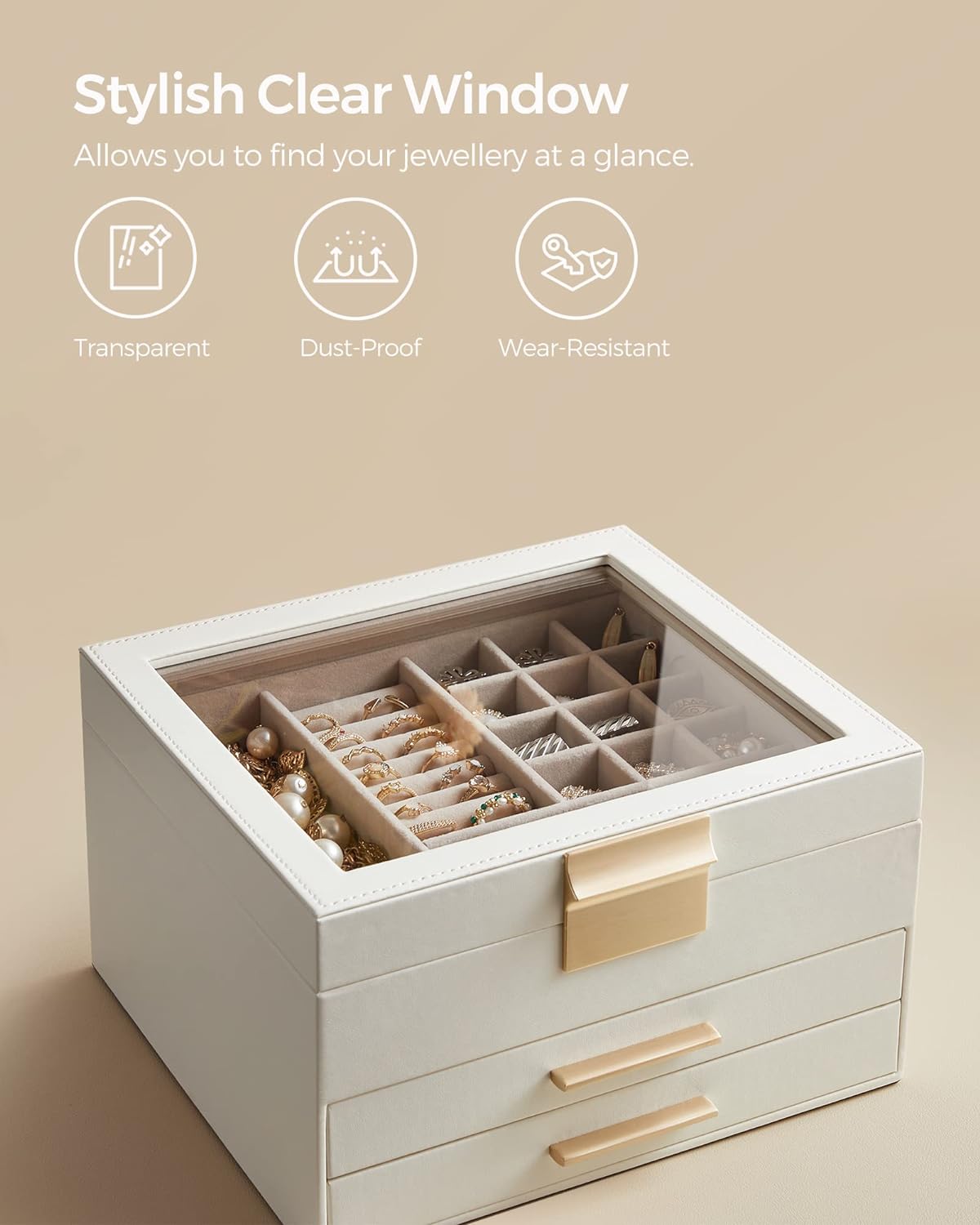 SONGMICS Cutie de bijuterii cu 3 nivele, 2 sertare, capac din sticla, 20x23x14cm, alb si auriu Household NewTrend