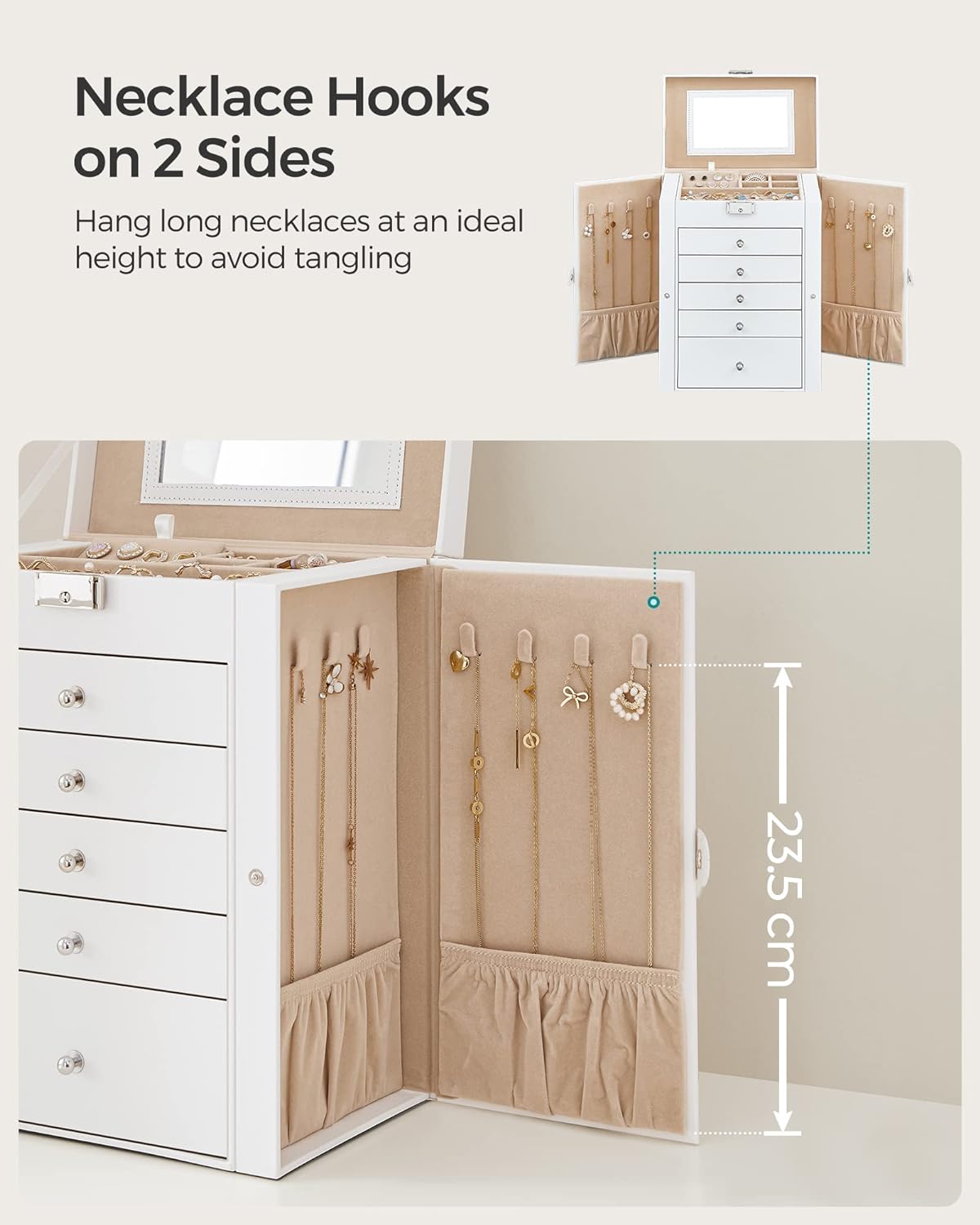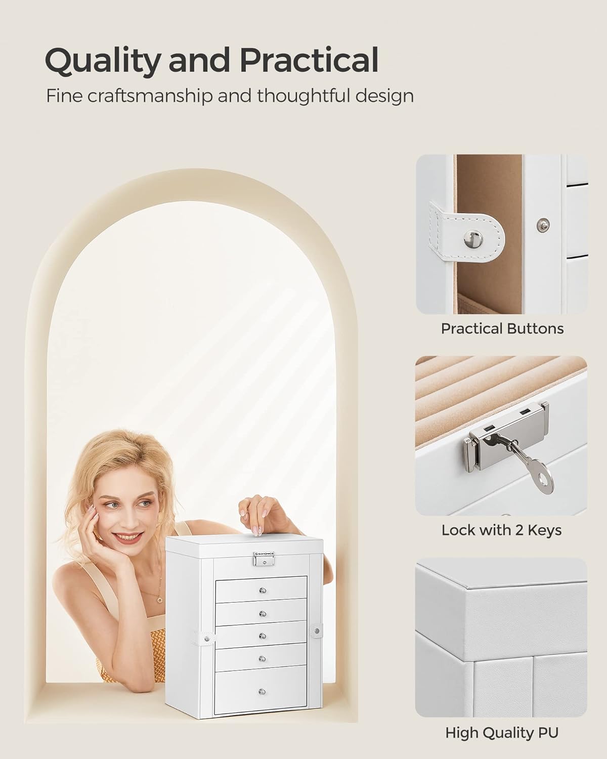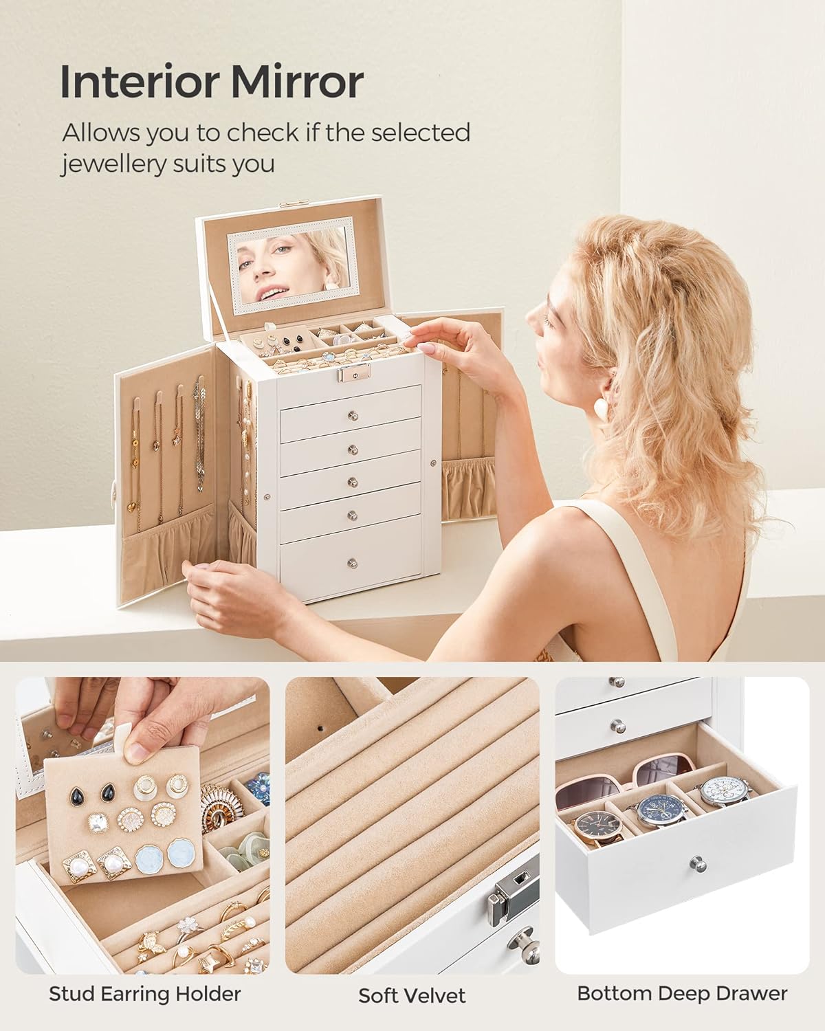 SONGMICS Cutie de bijuterii cu 6 nivele, 5 sertare, oglinda si incuietoare, spatiu pentru ceasuri, 26x15x32cm, alb Household NewTrend